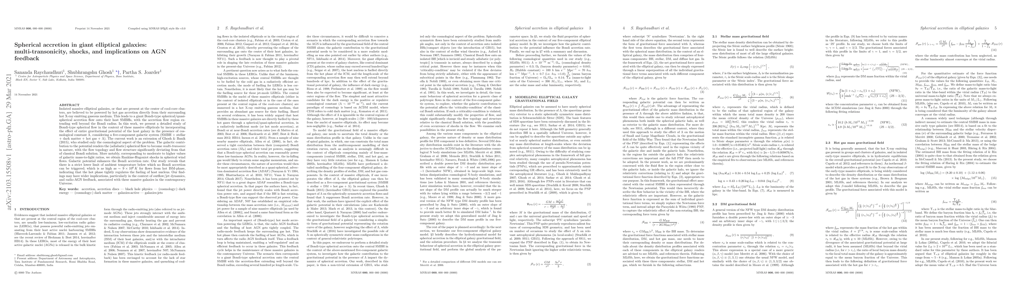 This paper investigates the multi-transonic spherical accretion flow in massive elliptical galaxies, revealing the presence of Rankine-Hugoniot shocks and a lower limit for ambient temperature necessary for Bondi accretion. The study suggests that galactic potential significantly influences accretion rates and AGN feedback dynamics.