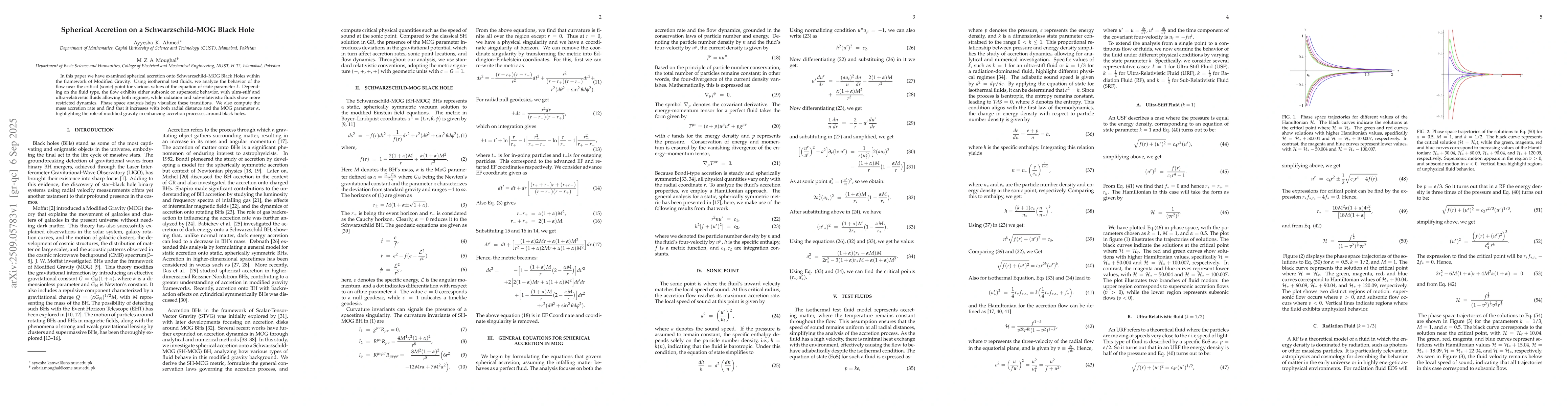 In this paper we have examined spherical accretion onto Schwarzschild MOG Black Holes within the framework of Modified Gravity. Using isothermal test fluids, we analyze the behavior of the flow near the critical (sonic) point for various values of the equation of state parameter $k$. Depending on the fluid type, the flow exhibits either subsonic or supersonic behavior, with ultra-stiff and ultra-relativistic fluids allowing both regimes, while radiation and sub-relativistic fluids show more restricted dynamics. Phase space analysis helps visualize these transitions. We also compute the mass accretion rate and find that it increases with both radial distance and the MOG parameter $\alpha$, highlighting the role of modified gravity in enhancing accretion processes around black holes