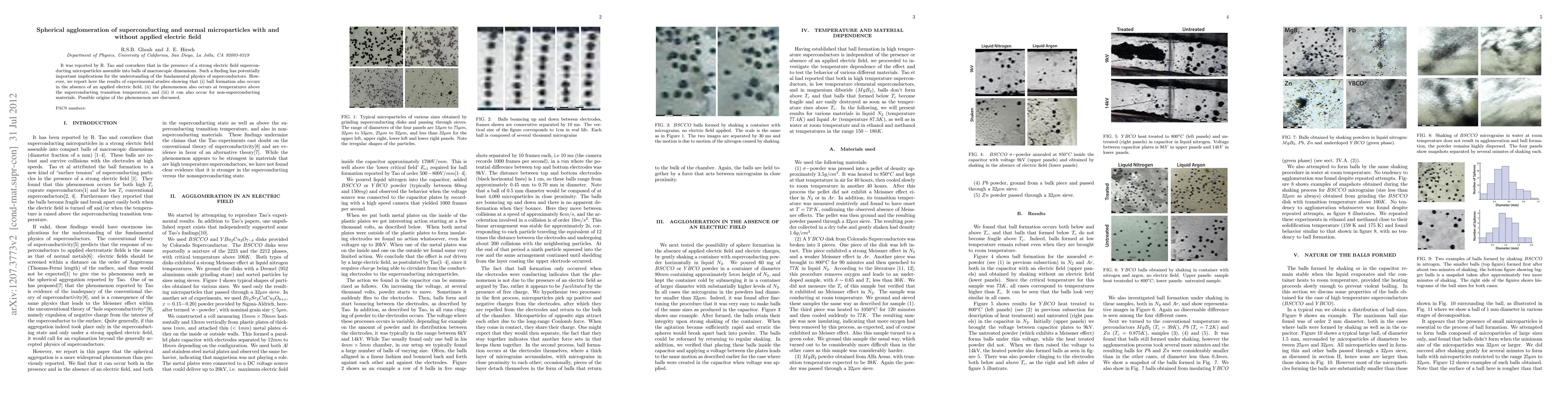 This paper reports that spherical agglomeration of microparticles into macroscopic balls can occur without an electric field, above the superconducting transition temperature, and even for non-superconducting materials, challenging previous assumptions about the role of electric fields in superconductivity. The implications for fundamental physics are significant.