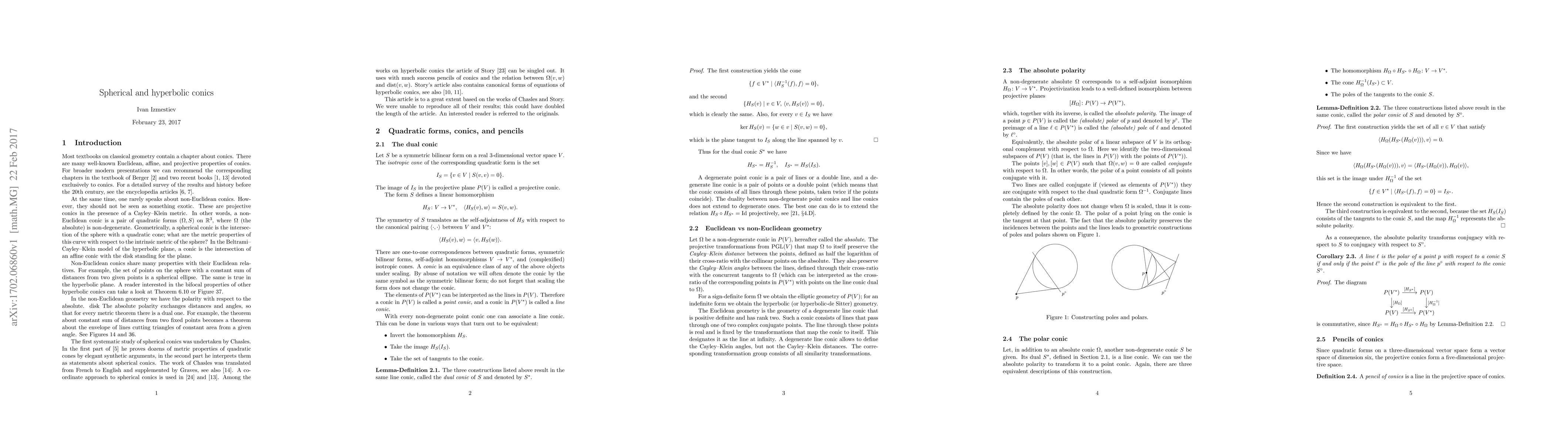 This paper surveys the metric properties of non-Euclidean conics, focusing on spherical and hyperbolic conics, and highlights their similarities and enhancements over Euclidean conics, particularly through the improved polarity in non-Euclidean geometries.