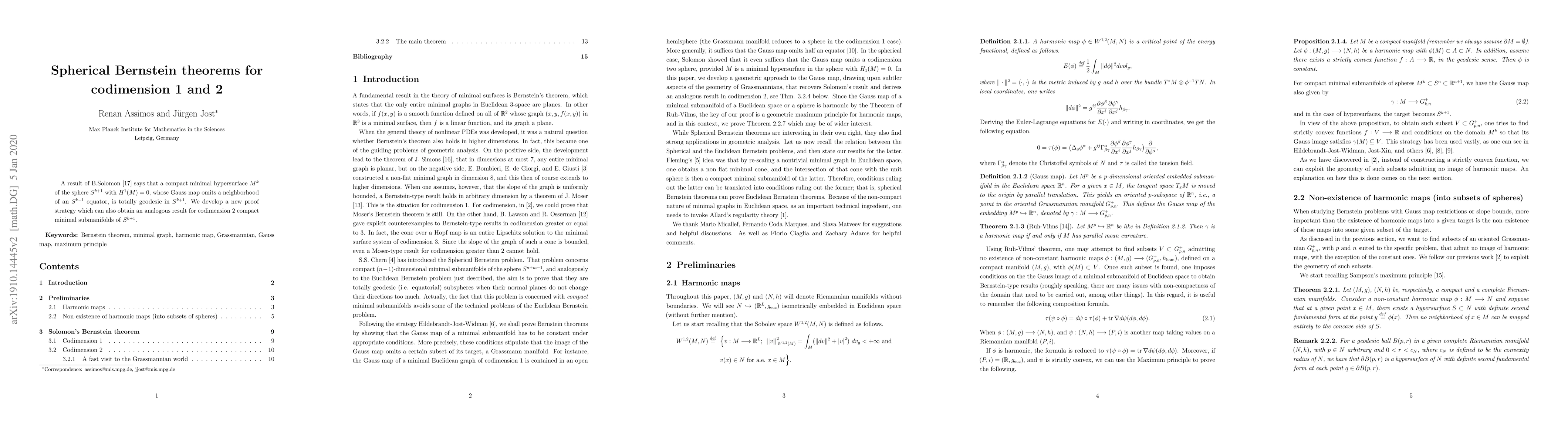 A result of B.Solomon (On the Gauss map of an area-minimizing hypersurface. 1984. Journal of Differential Geometry, 19(1), 221-232.) says that a compact minimal hypersurface $M^k$ of the sphere $S^{k+1}$ with $H^1(M)=0$, whose Gauss map omits a neighborhood of an $S^{k-1}$ equator, is totally geodesic in $S^{k+1}$. We develop a new proof strategy which can also obtain an analogous result for codimension 2 compact minimal submanifolds of $S^{k+1}$.