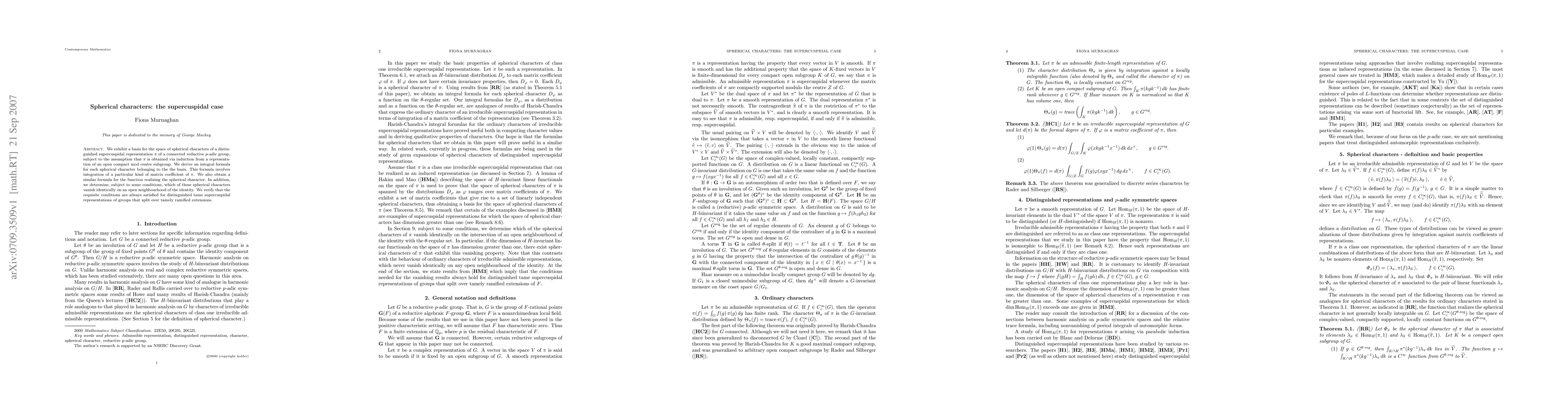 This paper provides a basis for spherical characters in a supercuspidal representation of a $p$-adic group, deriving integral formulas for these characters and determining which vanish near the identity, with verification for distinguished tame supercuspidal representations.