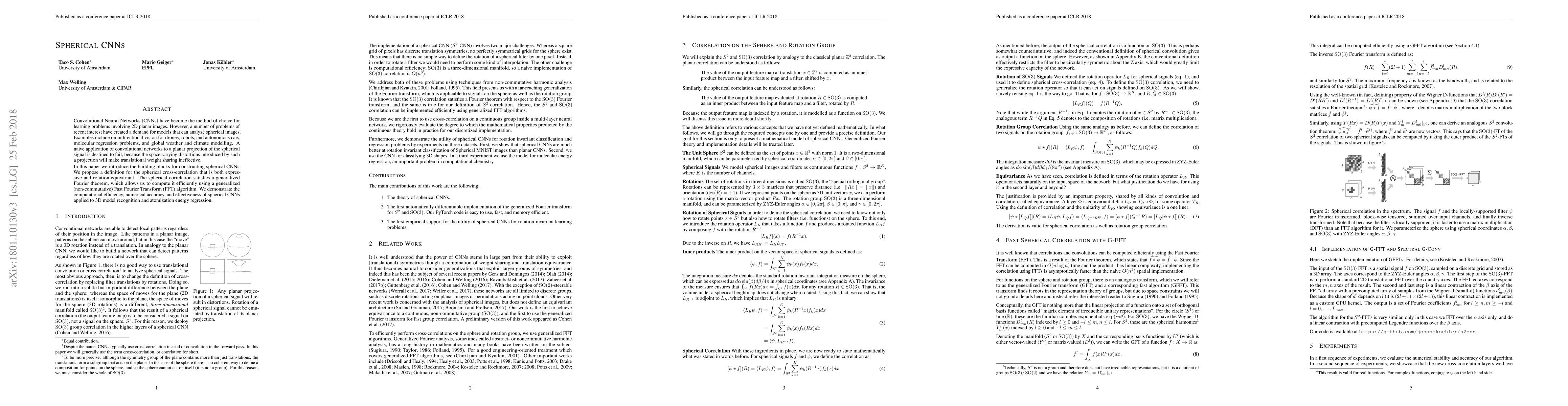 This paper introduces spherical CNNs to address problems involving spherical images, proposing a spherical cross-correlation that is rotation-equivariant and efficiently computable via a generalized FFT. The effectiveness of spherical CNNs is demonstrated through applications in 3D model recognition and atomization energy regression.
