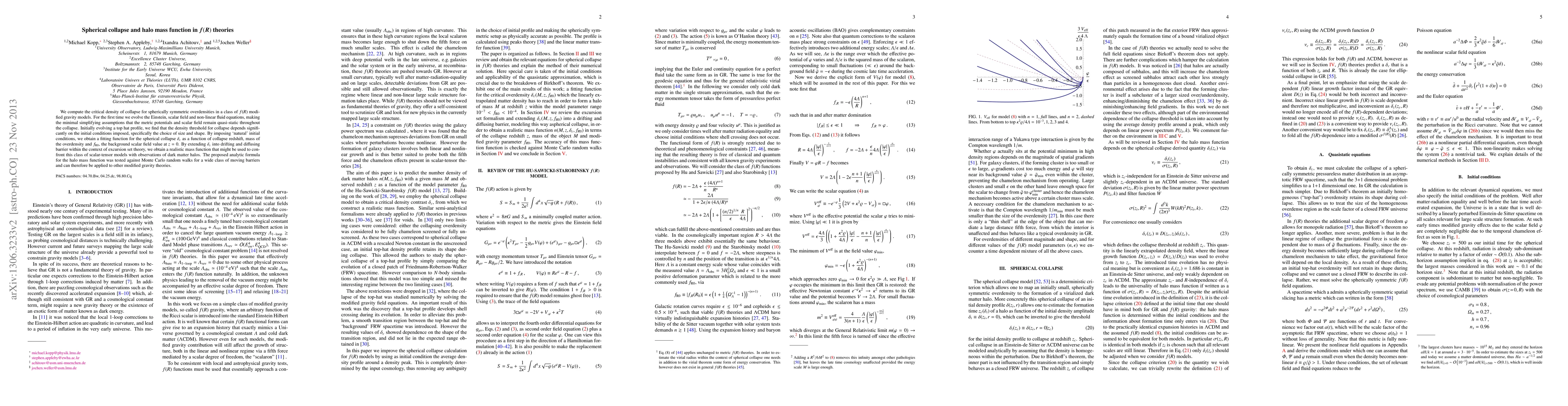 We compute the critical density of collapse for spherically symmetric overdensities in a class of f(R) modified gravity models. For the first time we evolve the Einstein, scalar field and non-linear fluid equations, making the minimal simplifying assumptions that the metric potentials and scalar field remain quasi-static throughout the collapse. Initially evolving a top hat profile, we find that the density threshold for collapse depends significantly on the initial conditions imposed, specifically the choice of size and shape. By imposing `natural' initial conditions, we obtain a fitting function for the spherical collapse delta_c as a function of collapse redshift, mass of the overdensity and f_{R0}, the background scalar field value at z=0. By extending delta_c into drifting and diffusing barrier within the context of excursion set theory, we obtain a realistic mass function that might be used to confront this class of scalar-tensor models with observations of dark matter halos. The proposed analytic formula for the halo mass function was tested against Monte Carlo random walks for a wide class of moving barriers and can therefore be applied to other modified gravity theories.