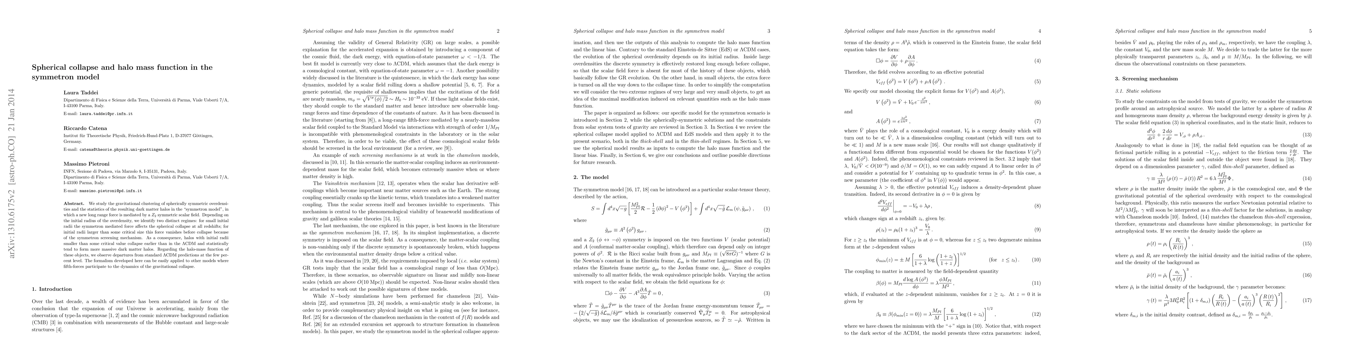 We study the gravitational clustering of spherically symmetric overdensities and the statistics of the resulting dark matter halos in the "symmetron model", in which a new long range force is mediated by a $Z_2$ symmetric scalar field. Depending on the initial radius of the overdensity, we identify two distinct regimes: for small initial radii the symmetron mediated force affects the spherical collapse at all redshifts; for initial radii larger than some critical size this force vanishes before collapse because of the symmetron screening mechanism. In both cases overdensities collapse earlier than in the $\Lambda$CDM and statistically tend to form more massive dark matter halos. Regarding the halo-mass function of these objects, we observe order one departures from standard $\Lambda$CDM predictions. The formalism developed here can be easily applied to other models where fifth-forces participate to the dynamics of the gravitational collapse.