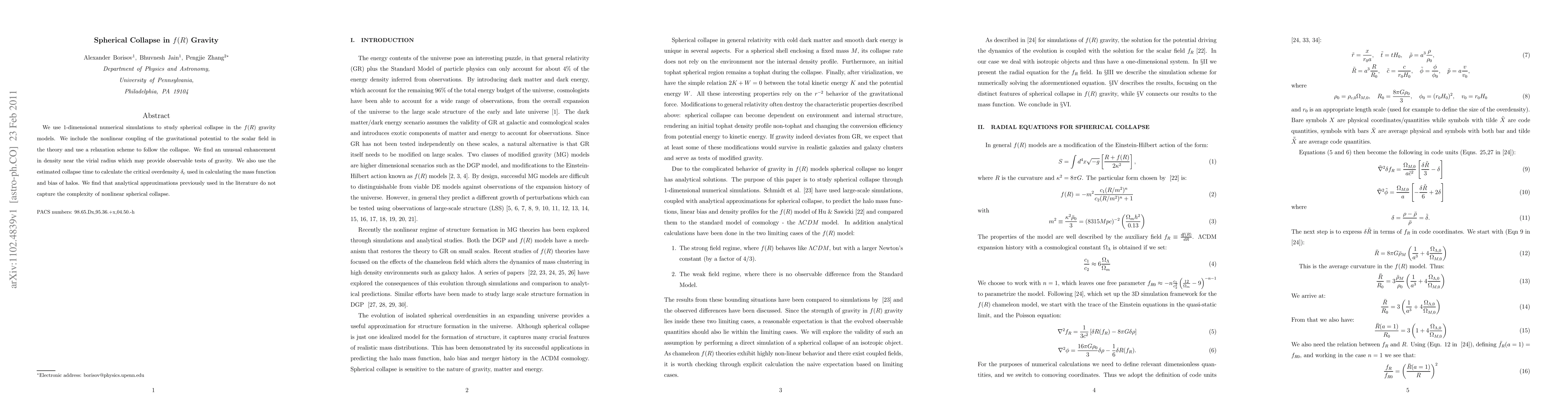 We use 1-dimensional numerical simulations to study spherical collapse in the f(R) gravity models. We include the nonlinear coupling of the gravitational potential to the scalar field in the theory and use a relaxation scheme to follow the collapse. We find an unusual enhancement in density near the virial radius which may provide observable tests of gravity. We also use the estimated collapse time to calculate the critical overdensity $\delta_c$ used in calculating the mass function and bias of halos. We find that analytical approximations previously used in the literature do not capture the complexity of nonlinear spherical collapse.