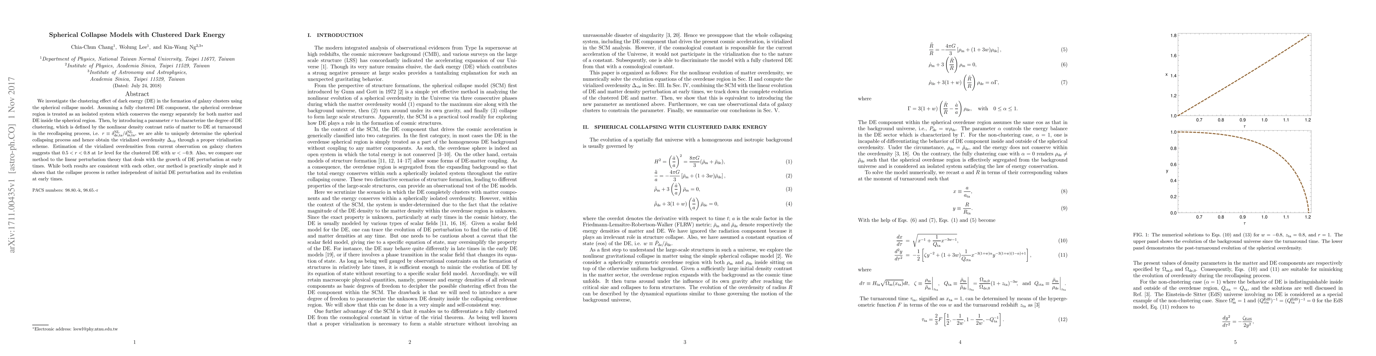 This paper explores the spherical collapse model to study galaxy cluster formation under the assumption that dark energy (DE) is fully clustered. It introduces a parameter $r$ to characterize the degree of DE clustering, leading to a determination of the virialized overdensity $\Dvir$. The findings suggest $0.5 < r < 0.8$ for clustered DE with $w < -0.9$, and the method is shown to be simpler and more independent of early DE perturbations than linear perturbation theory.