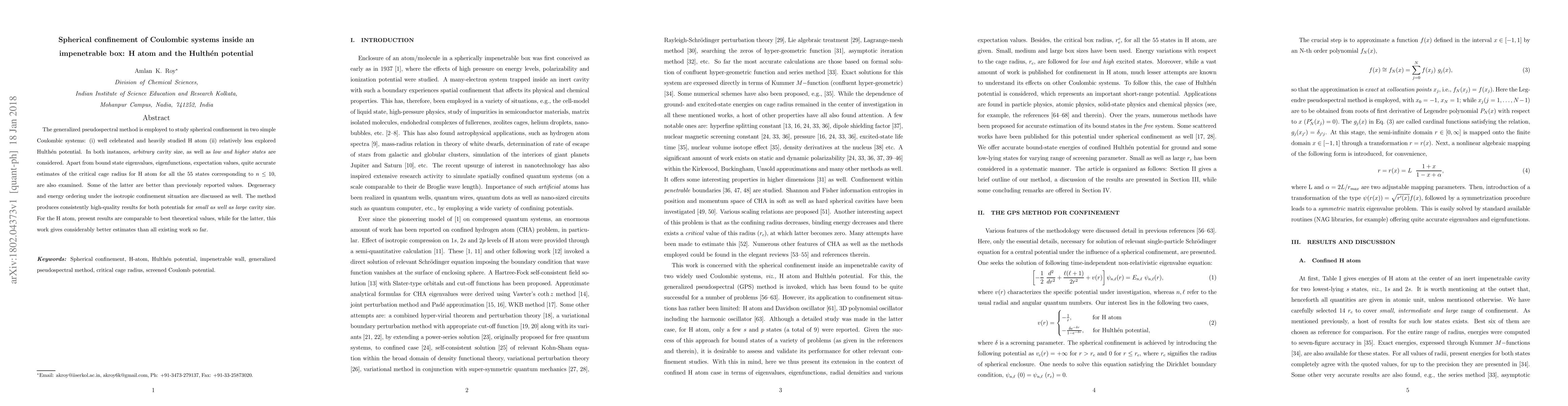 The generalized pseudospectral method is employed to study spherical confinement in two simple Coulombic systems: (i) well celebrated and heavily studied H atom (ii) relatively less explored Hulth\'en potential. In both instances, arbitrary cavity size, as well as low and higher states are considered. Apart from bound state eigenvalues, eigenfunctions, expectation values, quite accurate estimates of the critical cage radius for H atom for all the 55 states corresponding to $n \leq 10$, are also examined. Some of the latter are better than previously reported values. Degeneracy and energy ordering under the isotropic confinement situation are discussed as well. The method produces consistently high-quality results for both potentials for small as well as large cavity size. For the H atom, present results are comparable to best theoretical values, while for the latter, this work gives considerably better estimates than all existing work so far.