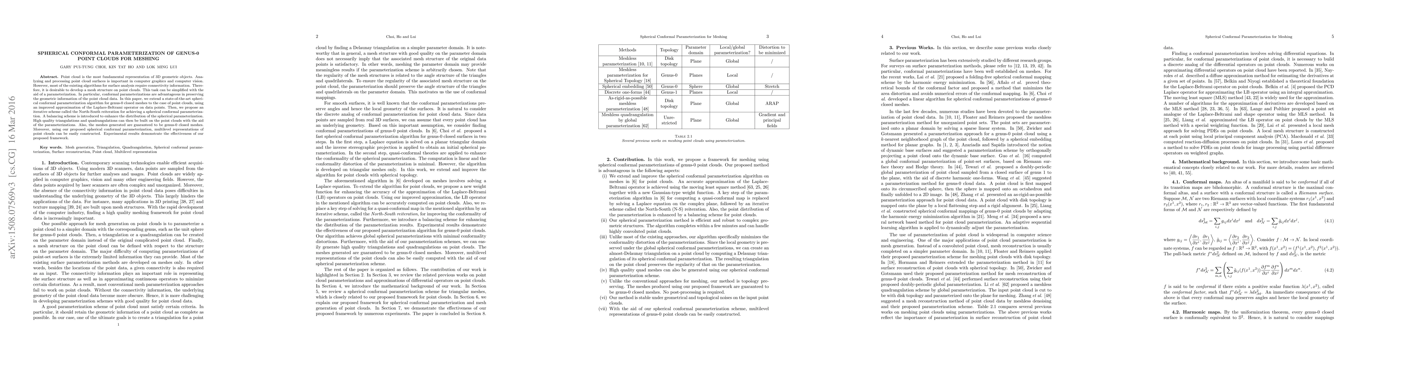 This paper presents an improved spherical conformal parameterization method for genus-0 point clouds, enabling high-quality mesh generation and multilevel representations. The method uses an iterative North-South reiteration scheme and a balancing scheme to achieve optimal parameterization and generate genus-0 closed meshes.