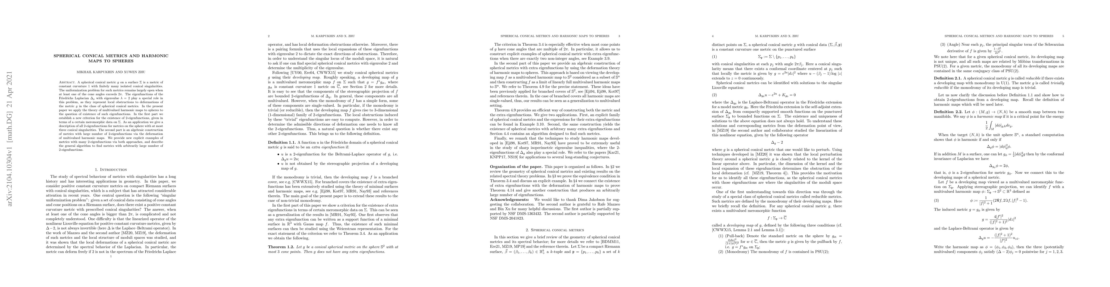 This paper explores spherical conical metrics with singularities and their associated eigenfunctions of the Friedrichs Laplacian. It establishes a new criterion for the existence of eigenfunctions with eigenvalue 2 and provides explicit examples of such metrics, particularly on the sphere with up to three singularities.