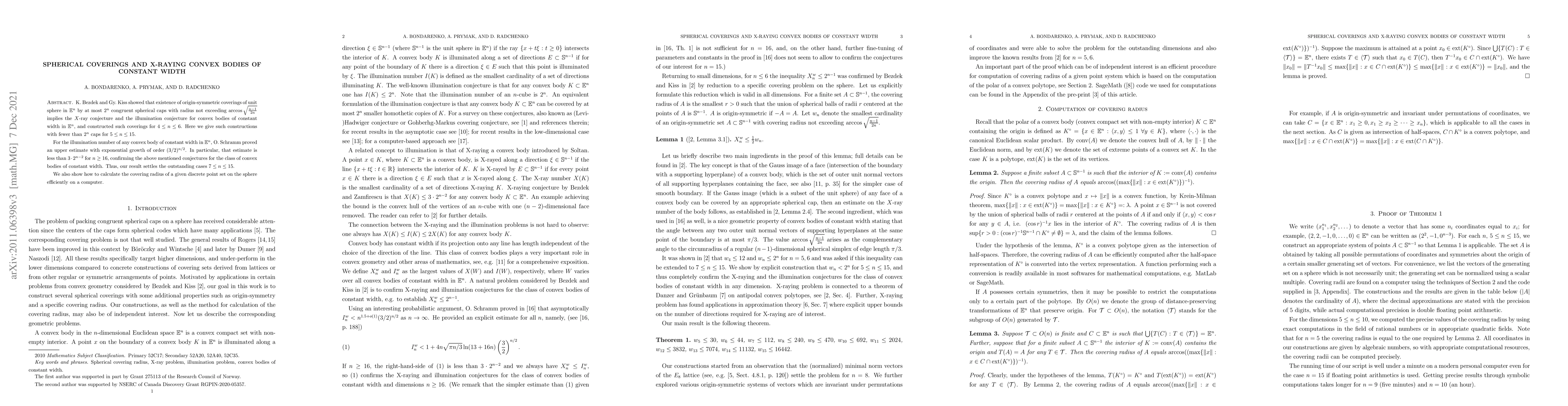 This paper constructs spherical coverings of the unit sphere in $\mathbb{E}^n$ using fewer than $2^n$ caps for $5\le n\le 15$, resolving the $X$-ray and illumination conjectures for convex bodies of constant width. It also confirms these conjectures for $n\ge 16$ and presents an efficient computational method for determining the covering radius of discrete point sets on the sphere.