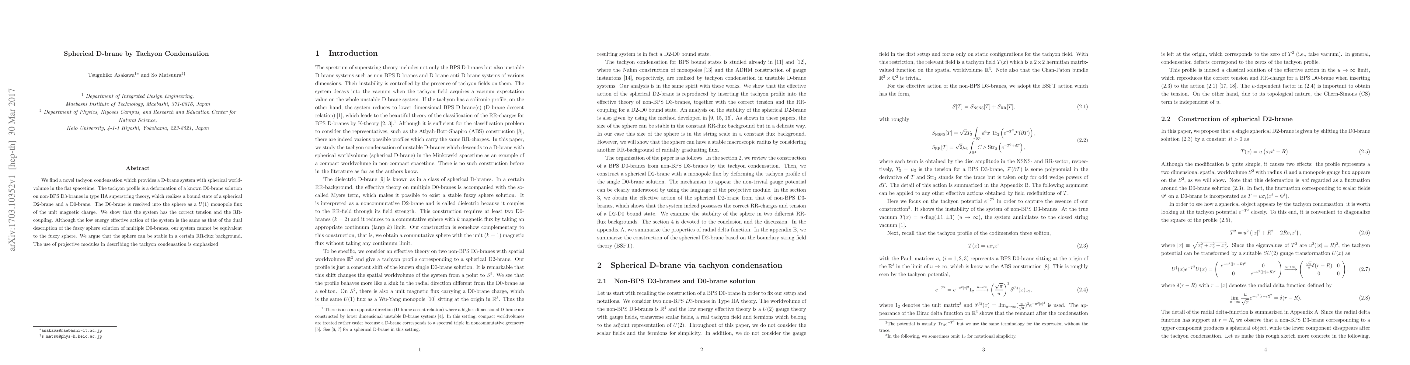 We find a novel tachyon condensation which provides a D-brane system with spherical worldvolume in the flat spacetime. The tachyon profile is a deformation of a known D0-brane solution on non-BPS D3-branes in type IIA superstring theory, which realizes a bound state of a spherical D2-brane and a D0-brane. The D0-brane is resolved into the sphere as a $U(1)$ monopole flux of the unit magnetic charge. We show that the system has the correct tension and the RR-coupling. Although the low energy effective action of the system is the same as that of the dual description of the fuzzy sphere solution of multiple D0-branes, our system cannot be equivalent to the fuzzy sphere. We argue that the sphere can be stable in a certain RR-flux background. The use of projective modules in describing the tachyon condensation is emphasized.