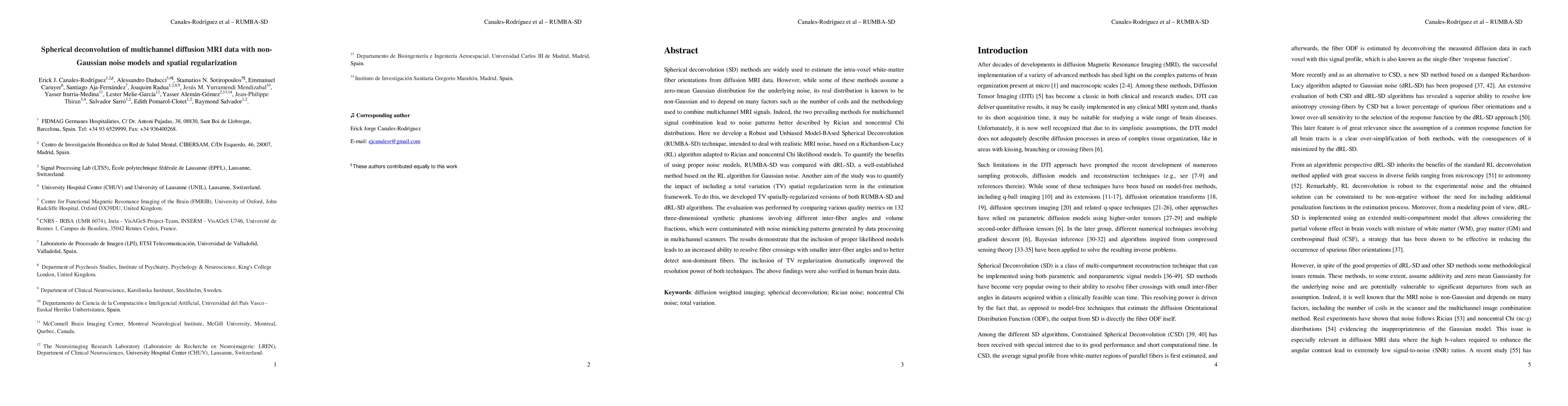 This paper introduces RUMBA-SD, a novel spherical deconvolution technique for multichannel diffusion MRI data, which accounts for non-Gaussian noise and incorporates spatial regularization. The method's performance was compared with a Gaussian noise-based method, showing improved resolution of fiber crossings and detection of non-dominant fibers, especially when combined with total variation regularization.