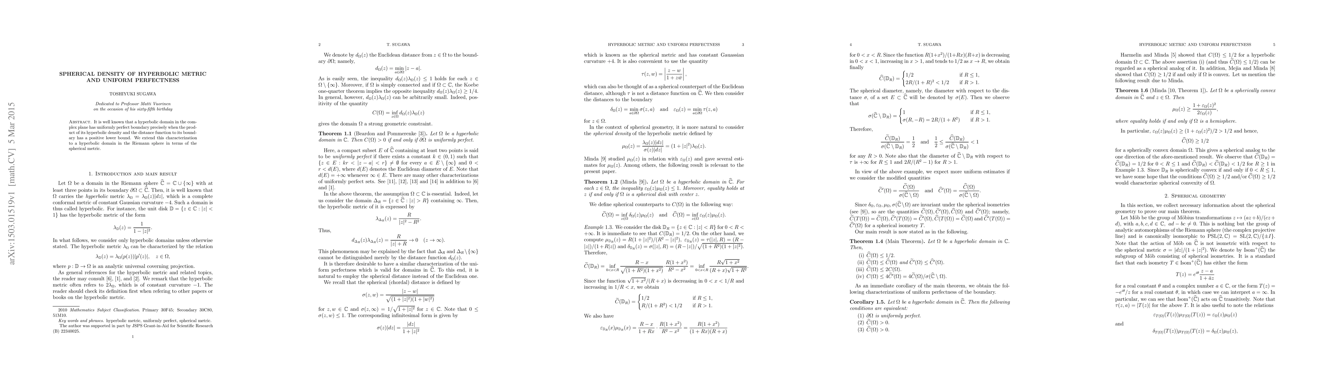 Summary: The paper extends the characterization of uniformly perfect boundaries in hyperbolic domains to the Riemann sphere, showing that such boundaries in the spherical metric have a positive lower bound for the product of hyperbolic density and distance to the boundary.