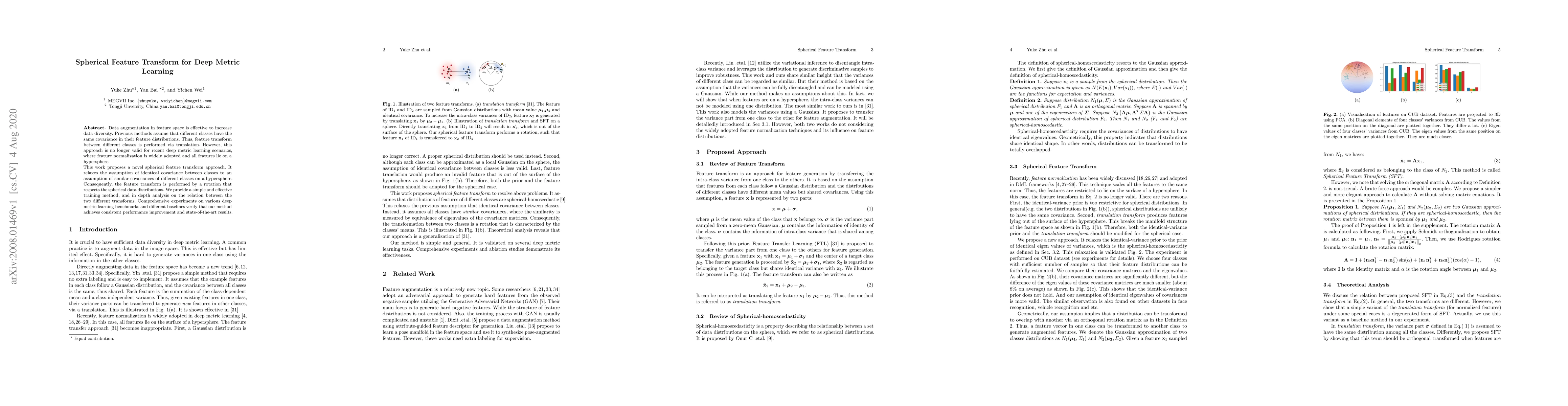 This paper proposes a spherical feature transform for deep metric learning that relaxes the assumption of identical covariance across classes, instead using rotation to transform features on a hypersphere. The method achieves state-of-the-art results across various benchmarks, demonstrating consistent performance improvement.