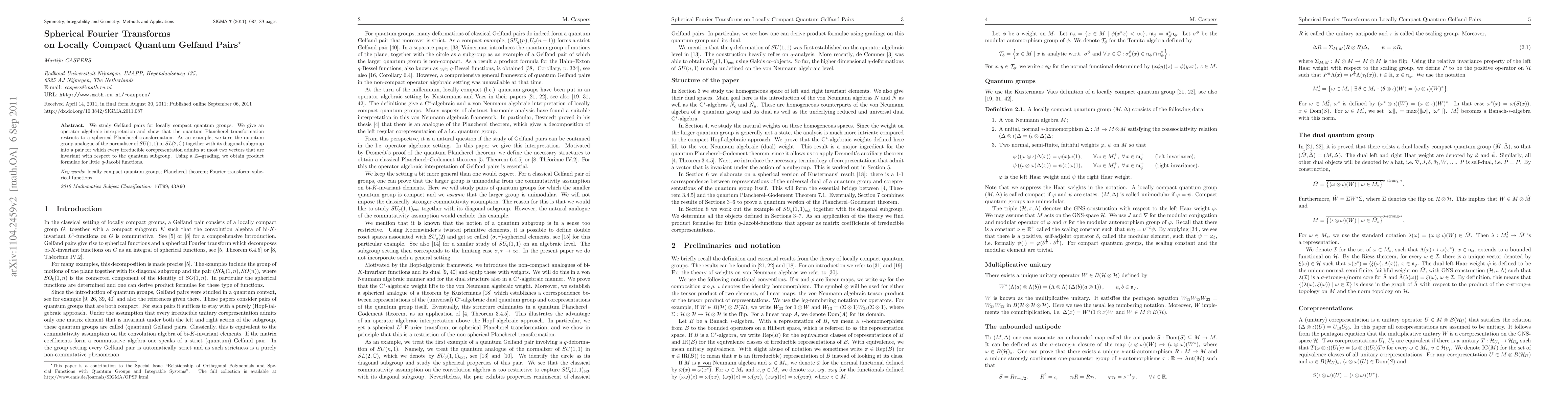 This paper explores Gelfand pairs within the context of locally compact quantum groups, providing an operator algebraic perspective and demonstrating that the quantum Plancherel transformation reduces to a spherical Plancherel transformation. It also examines a specific quantum group analogue, yielding product formulae for little $q$-Jacobi functions via a $\mathbb{Z}_2$-grading.