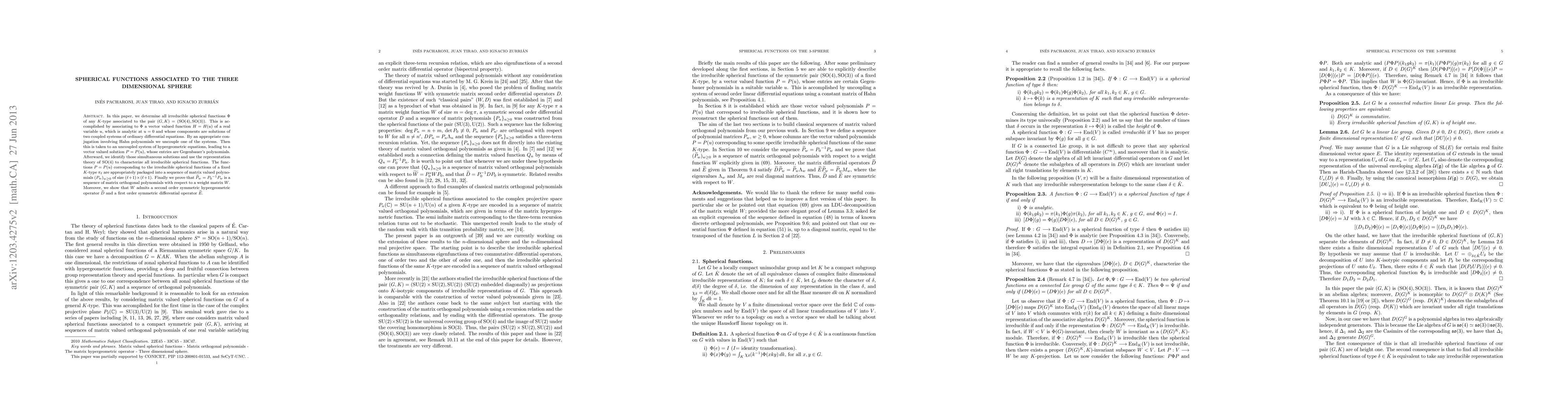 In this paper, we determine all irreducible spherical functions \Phi of any K -type associated to the pair (G,K)=(\SO(4),\SO(3)). This is accomplished by associating to \Phi a vector valued function H=H(u) of a real variable u, which is analytic at u=0 and whose components are solutions of two coupled systems of ordinary differential equations. By an appropriate conjugation involving Hahn polynomials we uncouple one of the systems. Then this is taken to an uncoupled system of hypergeometric equations, leading to a vector valued solution P=P(u) whose entries are Gegenbauer's polynomials. Afterward, we identify those simultaneous solutions and use the representation theory of \SO(4) to characterize all irreducible spherical functions. The functions P=P(u) corresponding to the irreducible spherical functions of a fixed K-type \pi_\ell are appropriately packaged into a sequence of matrix valued polynomials (P_w)_{w\ge0} of size (\ell+1)\times(\ell+1). Finally we proved that \widetilde P_w={P_0}^{-1}P_w is a sequence of matrix orthogonal polynomials with respect to a weight matrix W. Moreover we showed that W admits a second order symmetric hypergeometric operator \widetilde D and a first order symmetric differential operator \widetilde E.