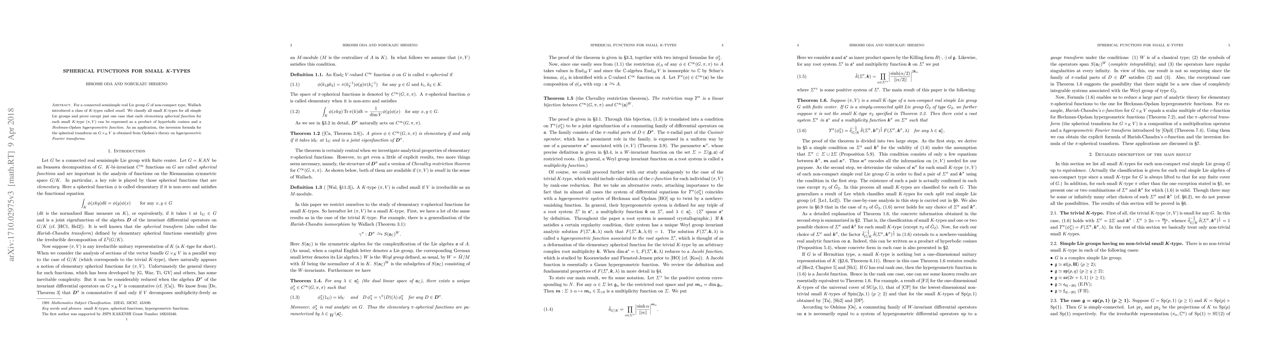 This paper classifies small K-types for simple Lie groups, showing that their spherical functions can be expressed as products of hyperbolic cosines and a specific type of hypergeometric function, with implications for the inversion formula on G x_K V.