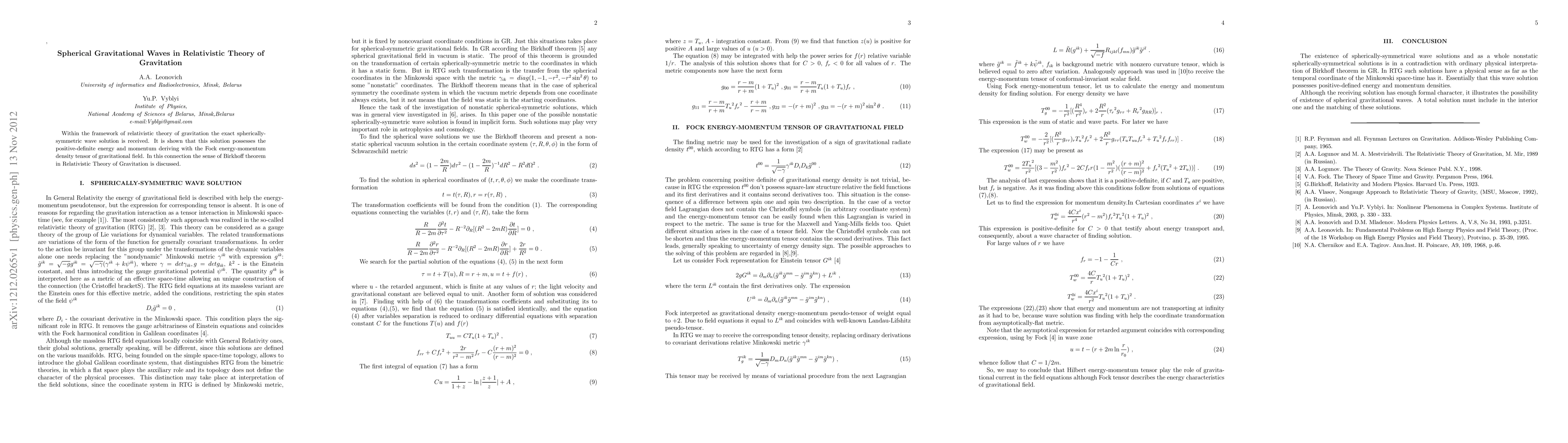 The paper presents an exact spherically-symmetric wave solution in relativistic gravitation, demonstrating its positive-definite energy and momentum using the Fock tensor. It also examines the implications of the Birkhoff theorem within this theoretical framework.