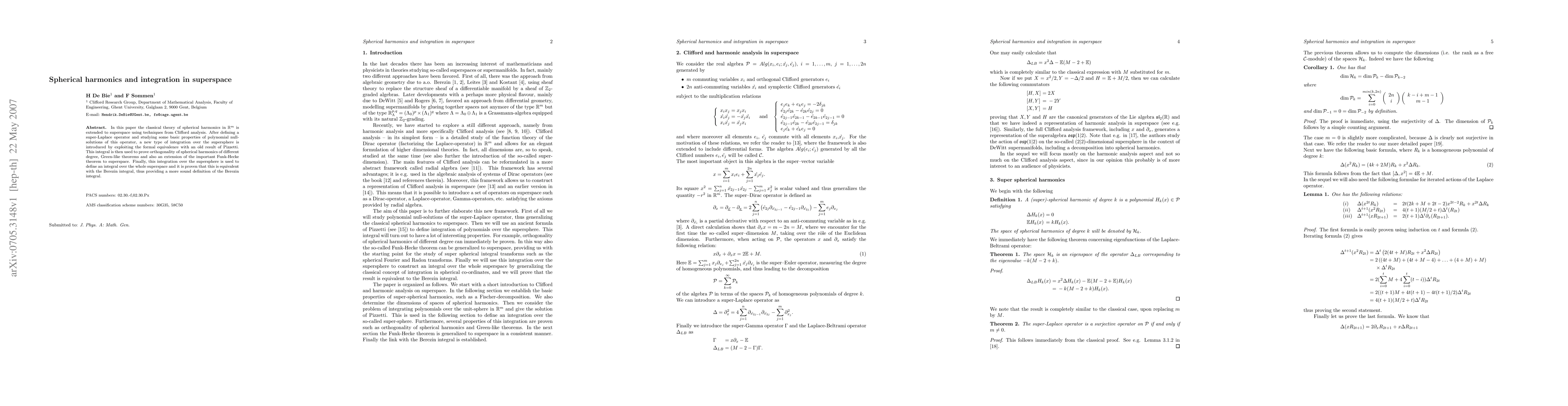In this paper the classical theory of spherical harmonics in R^m is extended to superspace using techniques from Clifford analysis. After defining a super-Laplace operator and studying some basic properties of polynomial null-solutions of this operator, a new type of integration over the supersphere is introduced by exploiting the formal equivalence with an old result of Pizzetti. This integral is then used to prove orthogonality of spherical harmonics of different degree, Green-like theorems and also an extension of the important Funk-Hecke theorem to superspace. Finally, this integration over the supersphere is used to define an integral over the whole superspace and it is proven that this is equivalent with the Berezin integral, thus providing a more sound definition of the Berezin integral.