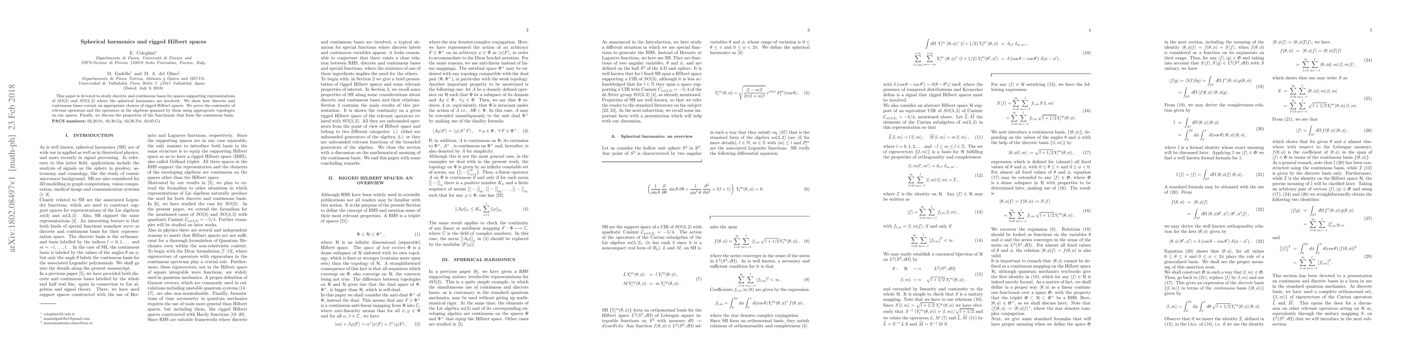 This paper investigates the coexistence of discrete and continuous bases, including spherical harmonics, for spaces representing SO(3) and SO(3,2) on rigged Hilbert spaces, proving continuity of relevant operators and discussing properties of functionals forming the continuous basis.