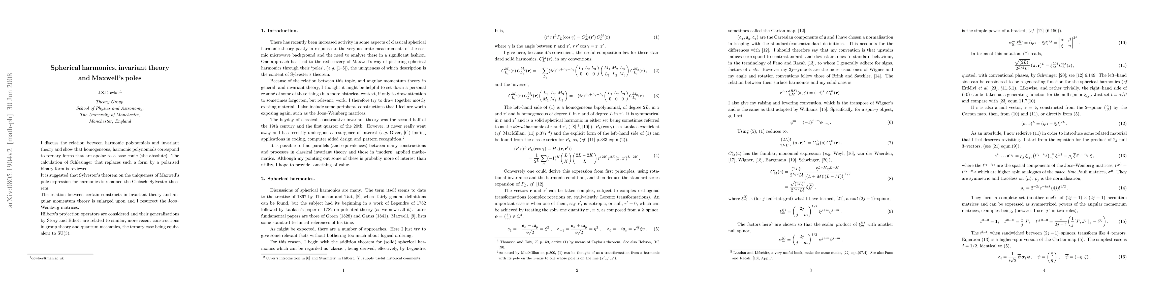 The paper explores the connection between spherical harmonics, invariant theory, and Maxwell's poles, revealing a relationship with ternary forms, Hilbert projection operators, and group theory, with implications for angular momentum theory and quantum mechanics.