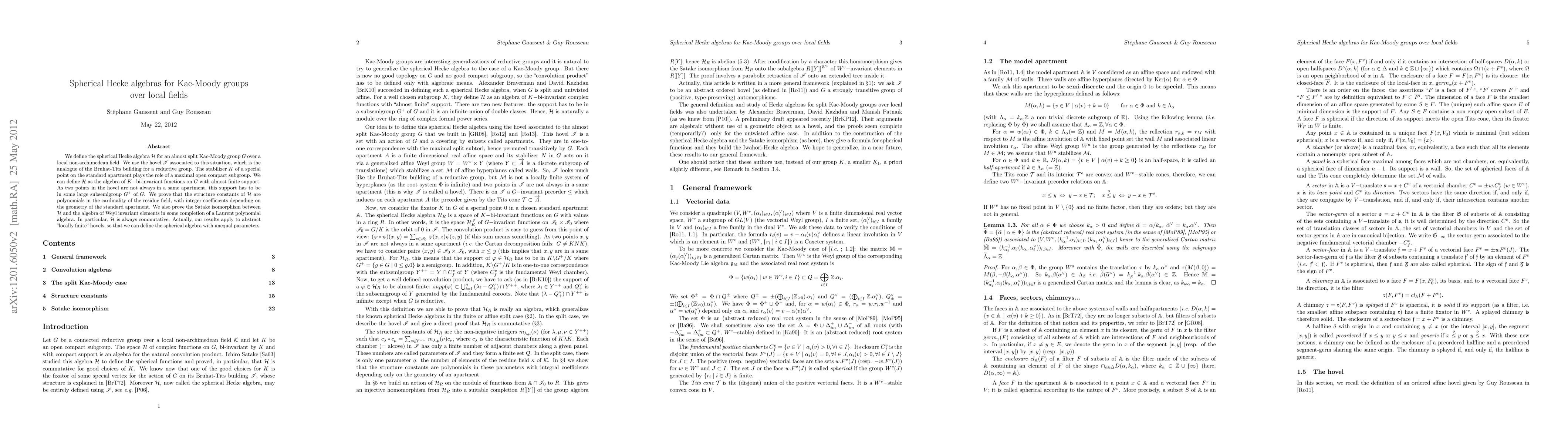 This paper defines the spherical Hecke algebra for Kac-Moody groups over local non-archimedean fields, proving that its structure constants are polynomials in the residue field cardinality and establishing a Satake isomorphism, showing the algebra is always commutative. The results extend to locally finite hovels.