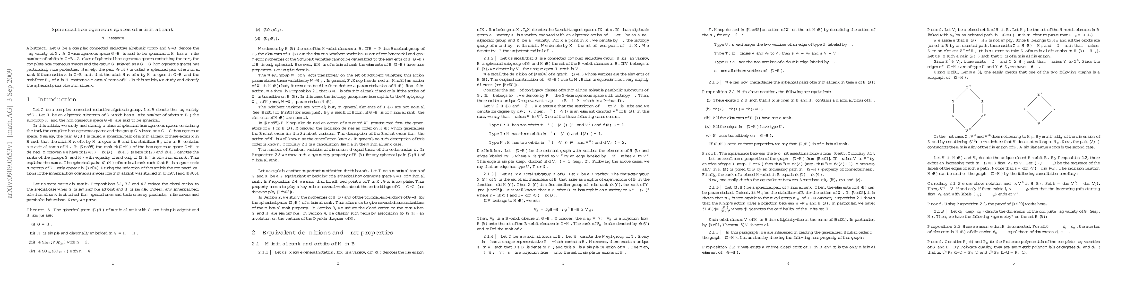 This paper classifies spherical homogeneous spaces of minimal rank for complex connected reductive algebraic groups, focusing on pairs $(G,H)$ where $H$ acts on $G/B$ with an open orbit and $H_x$ contains a maximal torus of $H$. The study reveals the structure and properties of these special spherical pairs.
