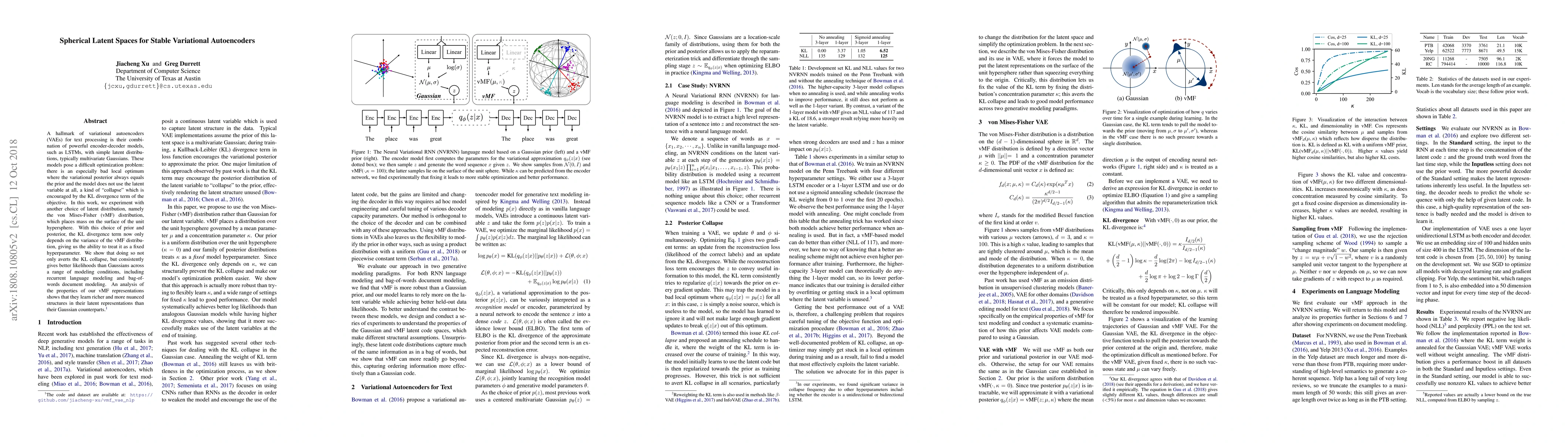 This paper proposes using spherical latent spaces via the von Mises-Fisher distribution in variational autoencoders to avoid the "KL collapse" issue, achieving better likelihoods and richer latent representations compared to traditional Gaussian latent distributions.
