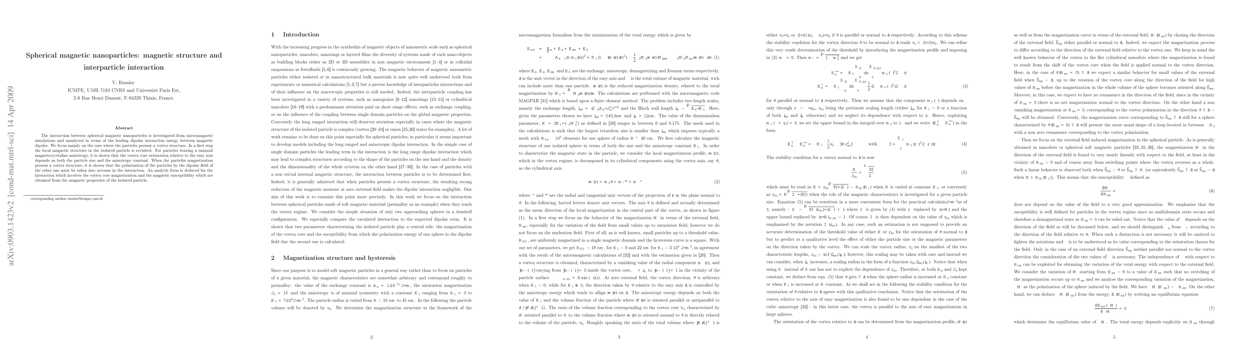 The interaction between spherical magnetic nanoparticles is investigated from micromagnetic simulations and ananlysed in terms of the leading dipolar interaction energy between magnetic dipoles. We focus mainly on the case where the particles present a vortex structure. In a first step the local magnetic structure in the isolated particle is revisited. For particles bearing a uniaxial magnetocrystaline anisotropy, it is shown that the vortex core orientation relative to the easy axis depends on both the particle size and the anisotropy constant. When the particles magnetization present a vortex structure, it is shown that the polarization of the particles by the dipolar field of the other one must be taken into account in the interaction. An analytic form is deduced for the interaction which involves the vortex core magnetization and the magnetic susceptibility which are obtained from the magnetic properties of the isolated particle.