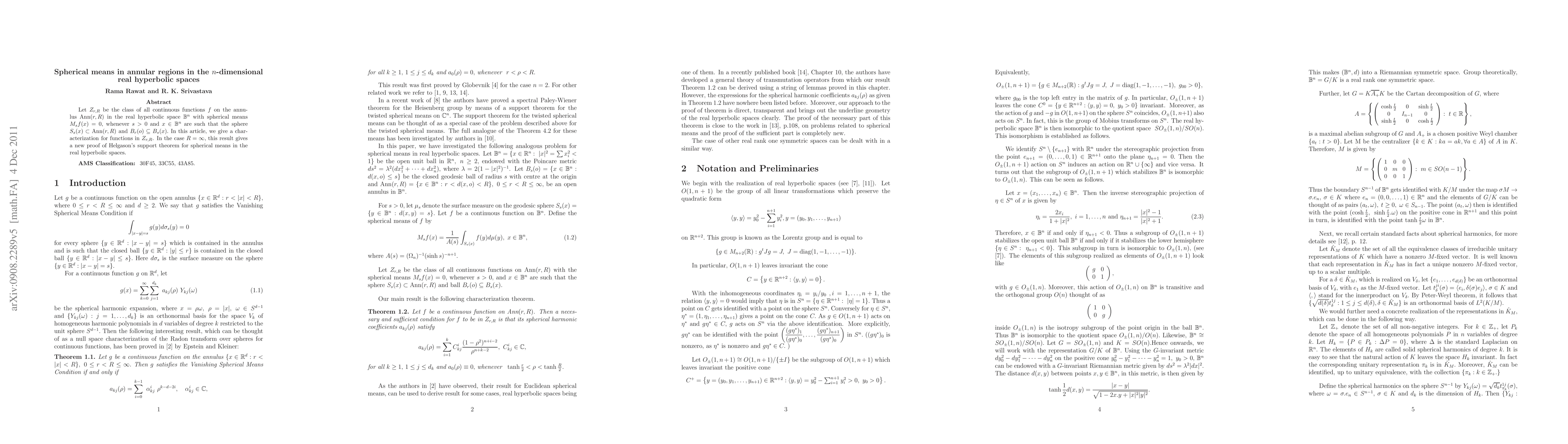 Let $Z_{r,R}$ be the class of all continuous functions $f$ on the annulus $\Ann(r,R)$ in the real hyperbolic space $\mathbb B^n$ with spherical means $M_sf(x)=0$, whenever $s>0$ and $x\in \mathbb B^n$ are such that the sphere $S_s(x)\subset \Ann(r, R) $ and $B_r(o)\subseteq B_s(x).$ In this article, we give a characterization for functions in $Z_{r,R}$. In the case $R=\infty$, this result gives a new proof of Helgason's support theorem for spherical means in the real hyperbolic spaces.