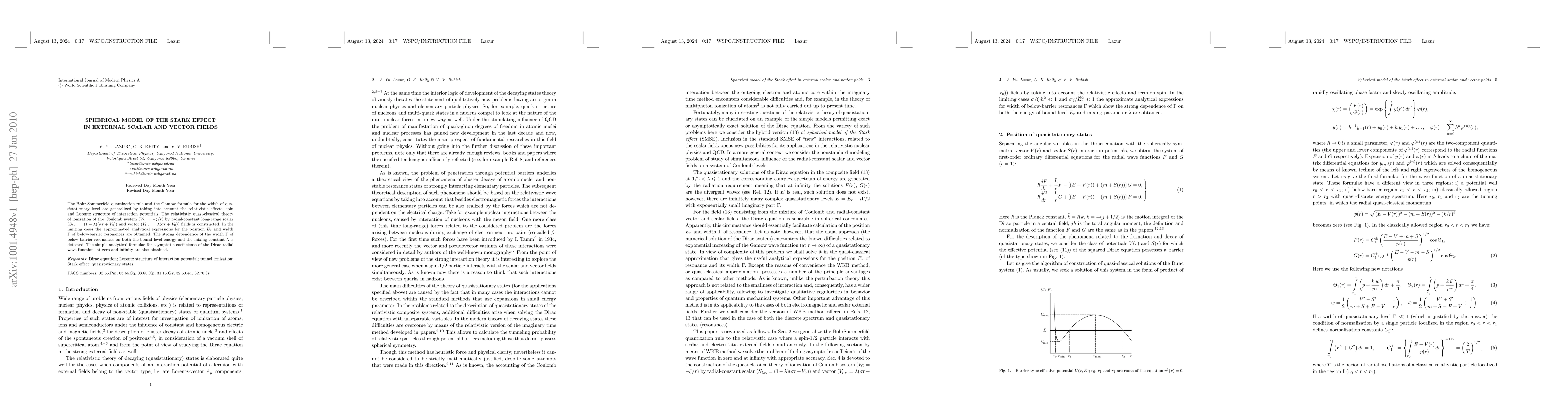 The Bohr-Sommerfeld quantization rule and the Gamow formula for the width of quasistationary level are generalized by taking into account the relativistic effects, spin and Lorentz structure of interaction potentials. The relativistic quasi-classical theory of ionization of the Coulomb system (V_{Coul}=-\xi/r) by radial-constant long-range scalar (S_{l.r.}=(1-\lambda)(\sigma r+V_0)) and vector (V_{l.r.}=\lambda(\sigma r+V_0)) fields is constructed. In the limiting cases the approximated analytical expressions for the position E_r and width \Gamma of below-barrier resonances are obtained. The strong dependence of the width \Gamma of below-barrier resonances on both the bound level energy and the mixing constant \lambda is detected. The simple analytical formulae for asymptotic coefficients of the Dirac radial wave functions at zero and infinity are also obtained.