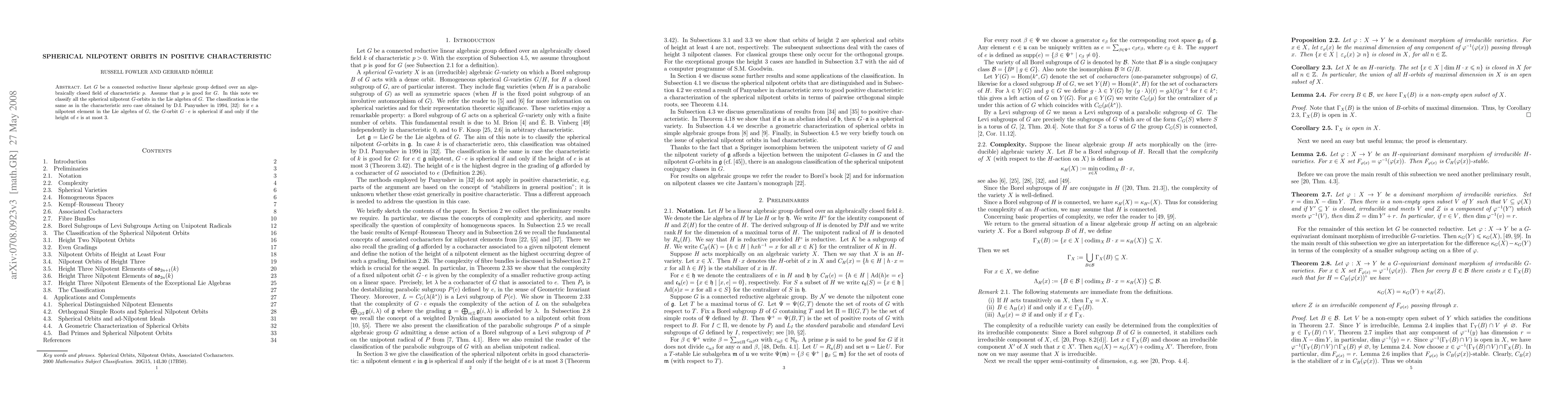This paper classifies spherical nilpotent orbits in the Lie algebra of a connected reductive group over a field of positive characteristic, demonstrating that the classification matches that found in characteristic zero, where nilpotent orbits are spherical if the nilpotent element's height is three or less.