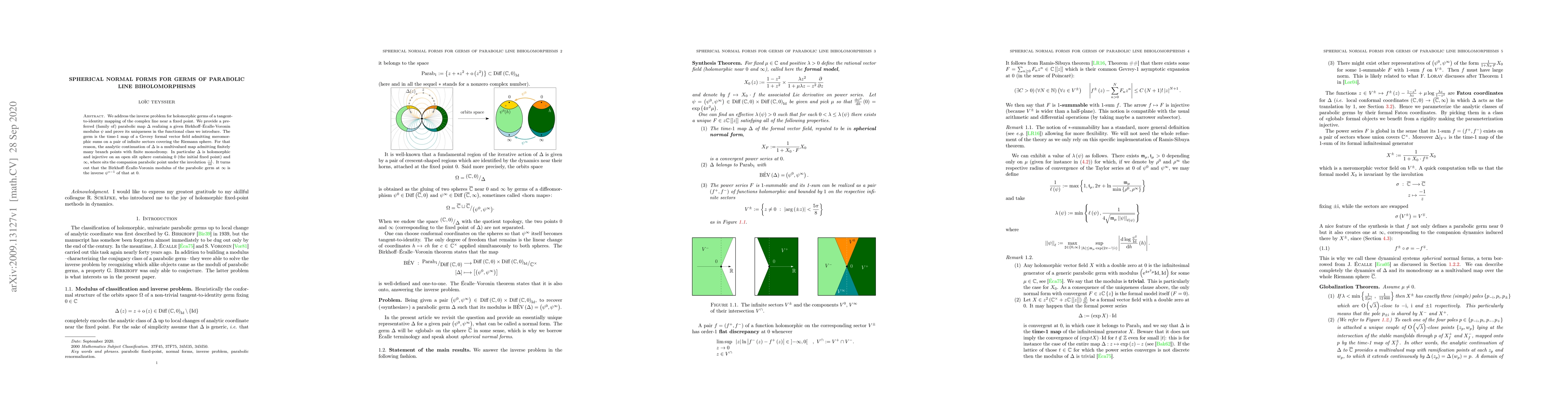 We address the inverse problem for holomorphic germs of a tangent-to-identity mapping of the complex line near a fixed point. We provide a preferred (family of) parabolic map $\Delta$ realizing a given Birkhoff--{\'E}calle-Voronin modulus $\psi$ and prove its uniqueness in the functional class we introduce. The germ is the time-1 map of a Gevrey formal vector field admitting meromorphic sums on a pair of infinite sectors covering the Riemann sphere. For that reason, the analytic continuation of $\Delta$ is a multivalued map admitting finitely many branch points with finite monodromy. In particular $\Delta$ is holomorphic and injective on an open slit sphere containing 0 (the initial fixed point) and $\infty$, where sits the companion parabolic point under the involution $\frac{-1}{\id}$. It turns out that the Birkhoff--{\'E}calle-Voronin modulus of the parabolic germ at $\infty$ is the inverse $\psi^{\circ-1}$ of that at 0.