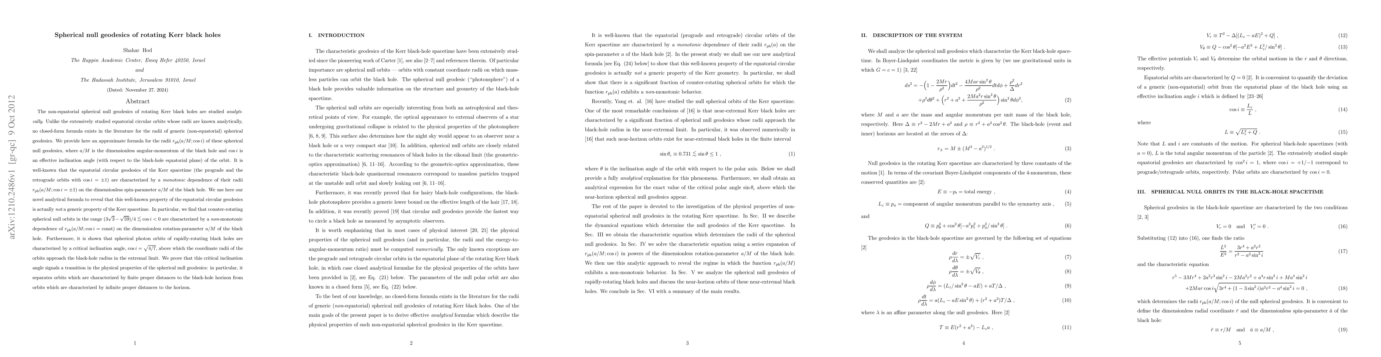 The non-equatorial spherical null geodesics of rotating Kerr black holes are studied analytically. Unlike the extensively studied equatorial circular orbits whose radii are known analytically, no closed-form formula exists in the literature for the radii of generic (non-equatorial) spherical geodesics. We provide here an approximate formula for the radii r_{ph}(a/M;cos i) of these spherical null geodesics, where a/M is the dimensionless angular-momentum of the black hole and cos i is an effective inclination angle (with respect to the black-hole equatorial plane) of the orbit. It is well-known that the equatorial circular geodesics of the Kerr spacetime (the prograde and the retrograde orbits with cos i=\pm 1) are characterized by a monotonic dependence of their radii r_{ph}(a/M;cos i=\pm 1) on the dimensionless spin-parameter a/M of the black hole. We use here our novel analytical formula to reveal that this well-known property of the equatorial circular geodesics is actually not a generic property of the Kerr spacetime. In particular, we find that counter-rotating spherical null orbits in the range (3\sqrt{3}-\sqrt{59})/4 \lesssim \cos i<0 are characterized by a non-monotonic dependence of r_{ph}(a/M;cos i=const) on the dimensionless rotation parameter a/M of the black hole. Furthermore, it is shown that spherical photon orbits of rapidly-rotating black holes are characterized by a critical inclination angle, cos i=\sqrt{4/7}, above which the coordinate radii of the orbits approach the black-hole radius in the extremal limit. We prove that this critical inclination angle signals a transition in the physical properties of the spherical null geodesics: in particular, it separates orbits which are characterized by finite proper distances to the black-hole horizon from orbits which are characterized by infinite proper distances to the horizon.