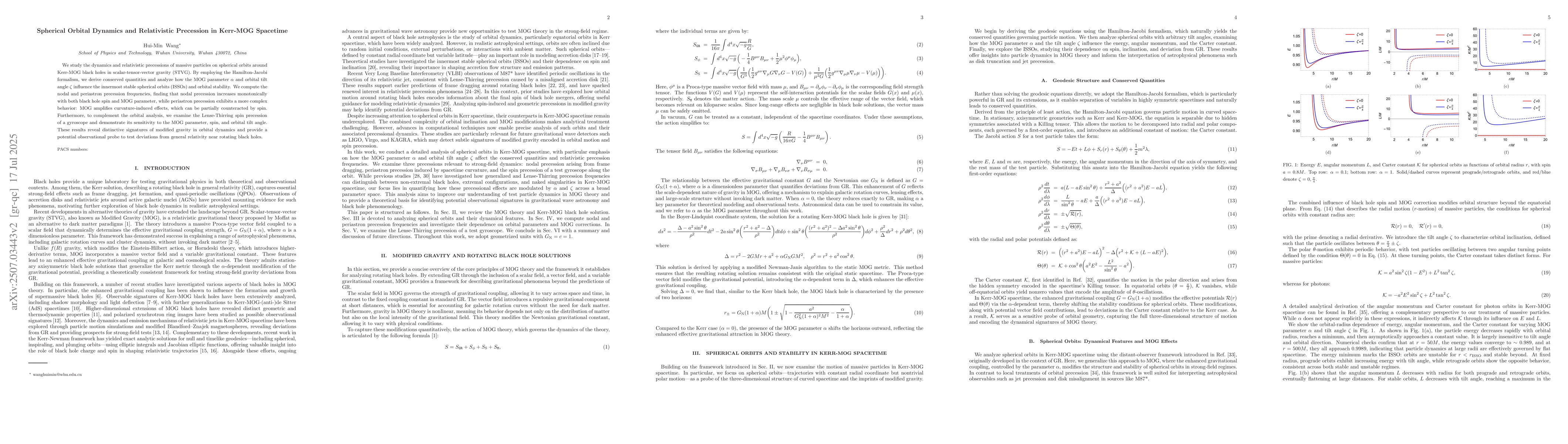 We study the dynamics and relativistic precessions of massive particles on spherical orbits around Kerr-MOG black holes in scalar-tensor-vector gravity (STVG). By employing the Hamilton-Jacobi formalism, we derive conserved quantities and analyze how the MOG parameter $\alpha$ and orbital tilt angle $\zeta$ influence the innermost stable spherical orbits (ISSOs) and orbital stability. We compute the nodal and periastron precession frequencies, finding that nodal precession increases monotonically with both black hole spin and MOG parameter, while periastron precession exhibits a more complex behavior: MOG amplifies curvature-induced effects, which can be partially counteracted by spin. Furthermore, to complement the orbital analysis, we examine the Lense-Thirring spin precession of a gyroscope and demonstrate its sensitivity to the MOG parameter, spin, and orbital tilt angle. These results reveal distinctive signatures of modified gravity in orbital dynamics and provide a potential observational probe to test deviations from general relativity near rotating black holes.