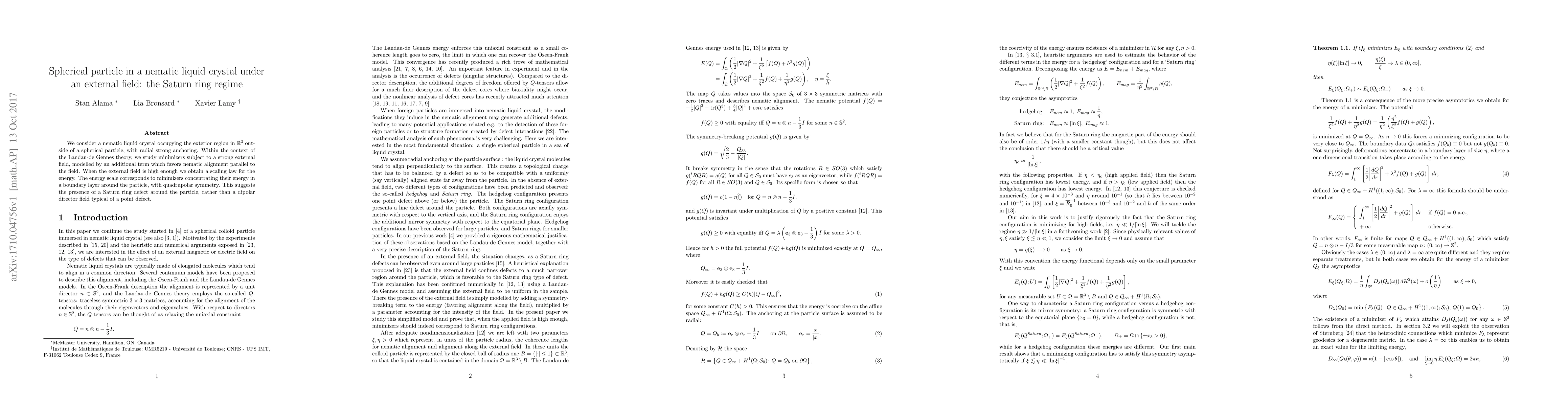 This paper explores nematic liquid crystals around a spherical particle under a strong external field, revealing a scaling law for high field strengths. The energy concentrates in a boundary layer with a quadrupolar symmetry, leading to a "Saturn ring" defect instead of the typical dipolar director field.
