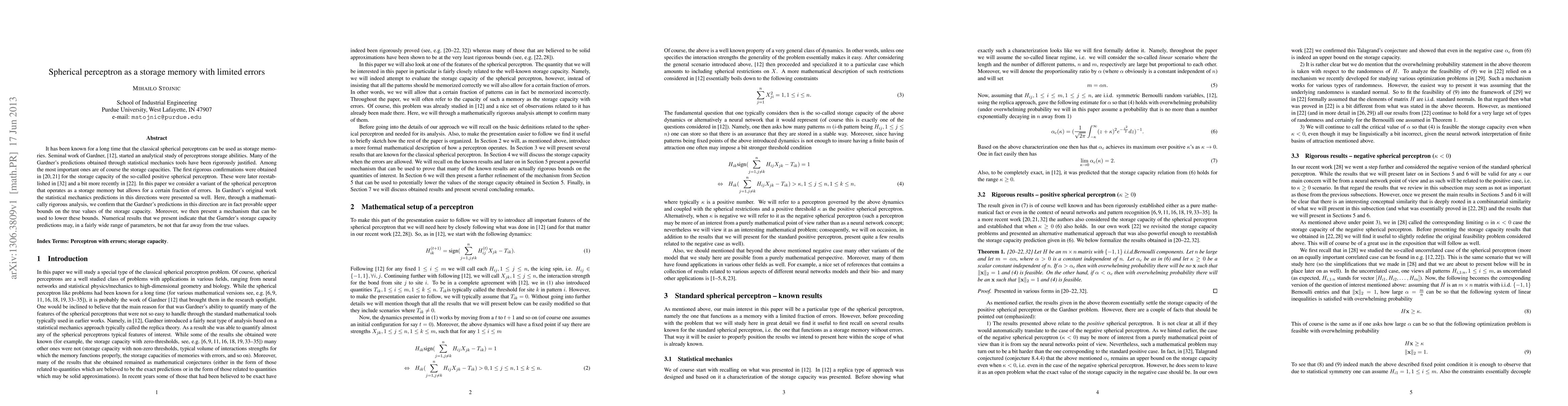 It has been known for a long time that the classical spherical perceptrons can be used as storage memories. Seminal work of Gardner, \cite{Gar88}, started an analytical study of perceptrons storage abilities. Many of the Gardner's predictions obtained through statistical mechanics tools have been rigorously justified. Among the most important ones are of course the storage capacities. The first rigorous confirmations were obtained in \cite{SchTir02,SchTir03} for the storage capacity of the so-called positive spherical perceptron. These were later reestablished in \cite{TalBook} and a bit more recently in \cite{StojnicGardGen13}. In this paper we consider a variant of the spherical perceptron that operates as a storage memory but allows for a certain fraction of errors. In Gardner's original work the statistical mechanics predictions in this directions were presented sa well. Here, through a mathematically rigorous analysis, we confirm that the Gardner's predictions in this direction are in fact provable upper bounds on the true values of the storage capacity. Moreover, we then present a mechanism that can be used to lower these bounds. Numerical results that we present indicate that the Garnder's storage capacity predictions may, in a fairly wide range of parameters, be not that far away from the true values.
