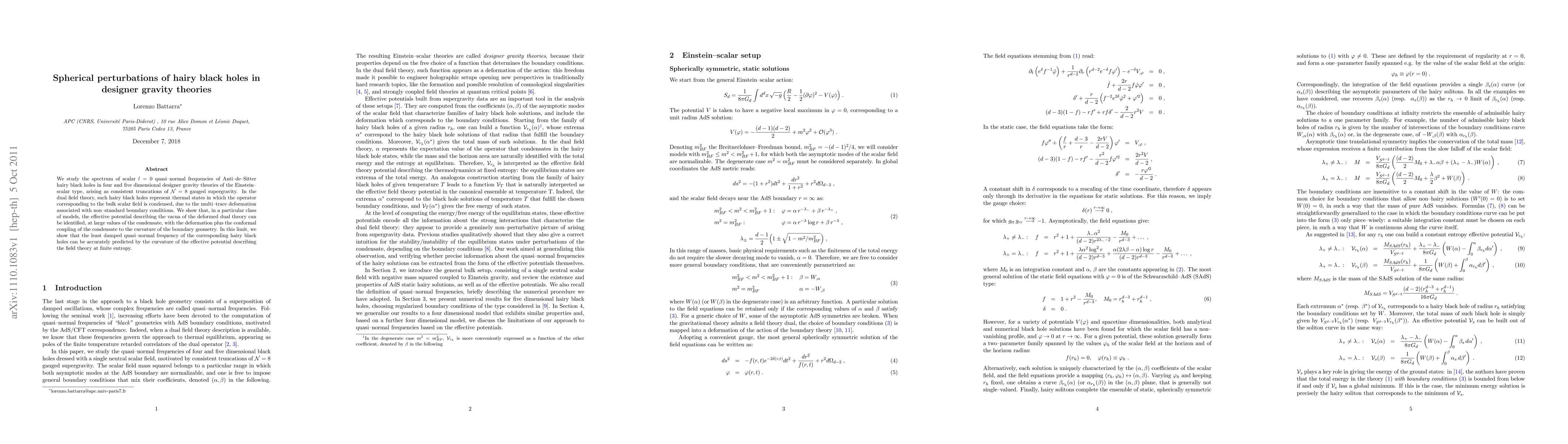 We study the spectrum of scalar $l=0$ quasi-normal frequencies of Anti-de-Sitter hairy black holes in four and five dimensional designer gravity theories of the Einstein-scalar type, arising as consistent truncations of $ \mathcal{N} = 8$ gauged supergravity. In the dual field theory, such hairy black holes represent thermal states in which the operator corresponding to the bulk scalar field is condensed, due to the multi-trace deformation associated with non-standard boundary conditions. We show that, in a particular class of models, the effective potential describing the vacua of the deformed dual theory can be identified, at large values of the condensate, with the deformation plus the conformal coupling of the condensate to the curvature of the boundary geometry. In this limit, we show that the least damped quasi-normal frequency of the corresponding hairy black holes can be accurately predicted by the curvature of the effective potential describing the field theory at finite entropy.