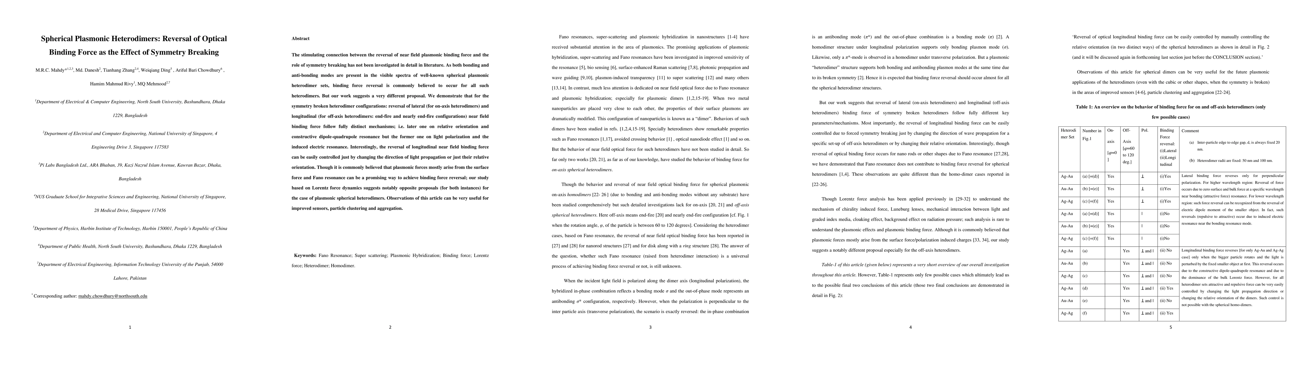 This paper investigates the reversal of optical binding forces in spherical plasmonic heterodimers, revealing distinct mechanisms for the reversal of lateral and longitudinal binding forces due to symmetry breaking. The study suggests that these mechanisms differ based on light polarization and orientation, challenging conventional beliefs about plasmonic forces and Fano resonance.