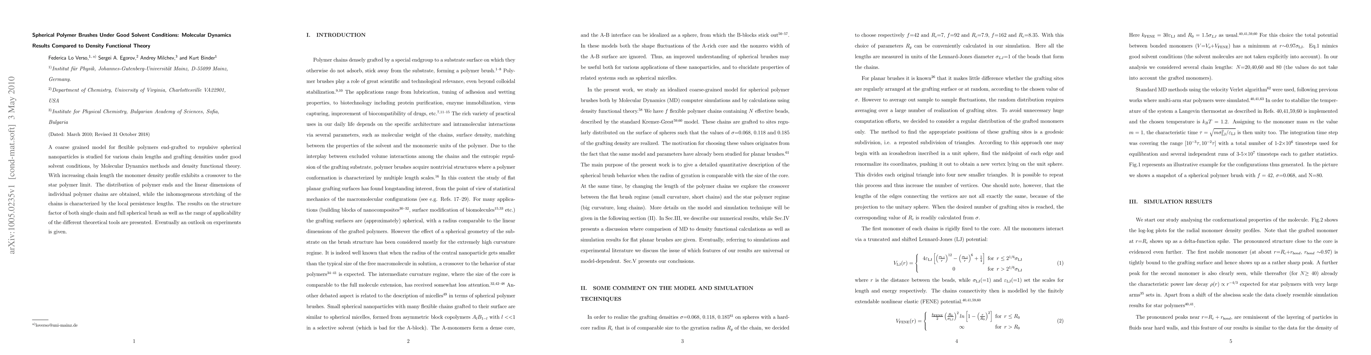 This paper investigates flexible polymer brushes on spherical nanoparticles under good solvent conditions using Molecular Dynamics and Density Functional Theory. The study reveals a transition to star polymer behavior with longer chains, and provides insights into the distribution of polymer ends and the stretching of individual chains.