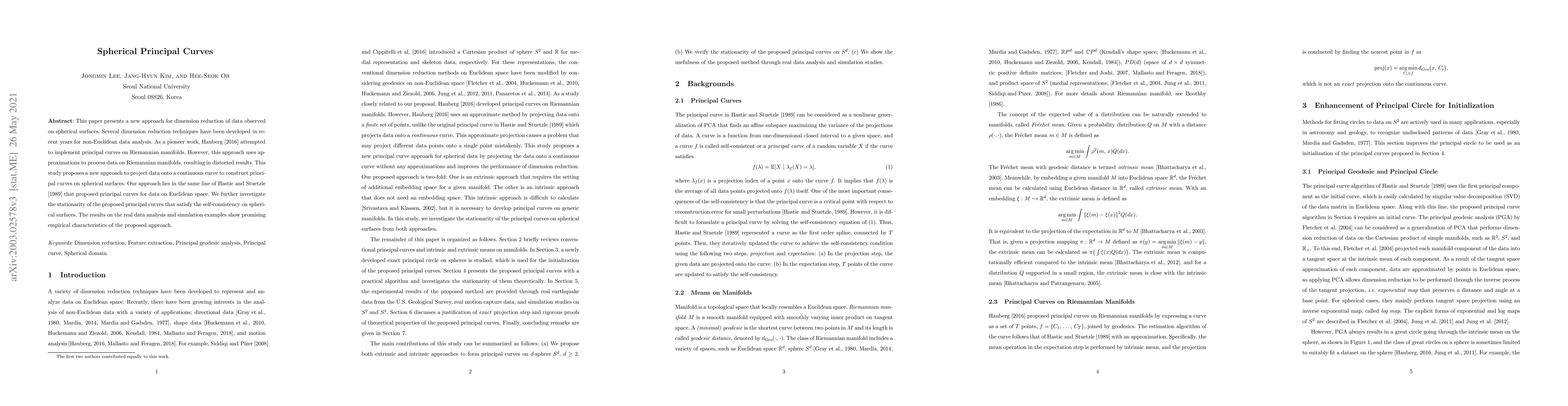 This paper introduces a novel method for dimension reduction of spherical data by constructing principal curves through data projection onto a continuous curve, improving upon previous approximations on Riemannian manifolds. The proposed approach maintains self-consistency and shows promising empirical results in analyzing earthquake data and simulation examples.