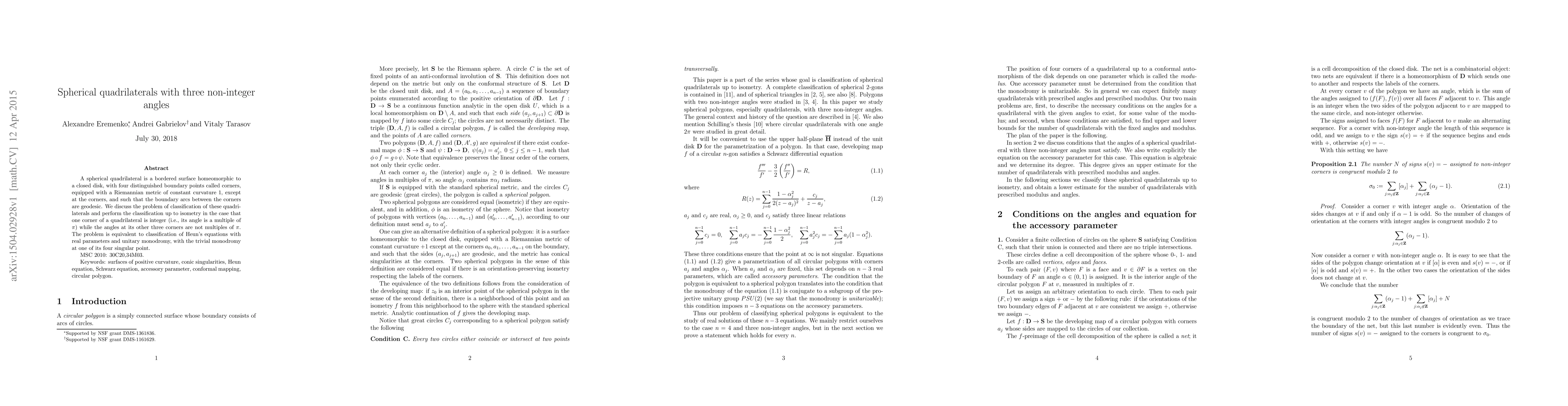 We classify spherical quadrilaterals up to isometry in the case when one inner angle is a multiple of pi while the other three are not. This is equivalent to classification of Heun's equations with real parameters and one apparent singularity such that the monodromy consists of unitary transformations.