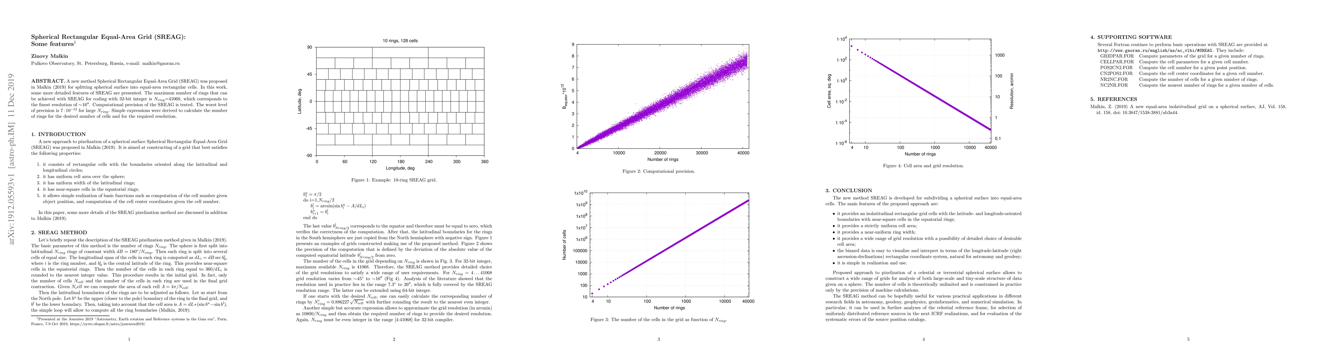 A new method Spherical Rectangular Equal-Area Grid (SREAG) was proposed in Malkin (2019) for splitting spherical surface into equal-area rectangular cells. In this work, some more detailed features of SREAG are presented. The maximum number of rings that can be achieved with SREAG for coding with 32-bit integer is $N_{ring}$=41068, which corresponds to the finest resolution of $\sim$16$''$. Computational precision of the SREAG is tested. The worst level of precision is $7\cdot10^{-12}$ for large $N_{ring}$. Simple expressions were derived to calculate the number of rings for the desired number of cells and for the required resolution.