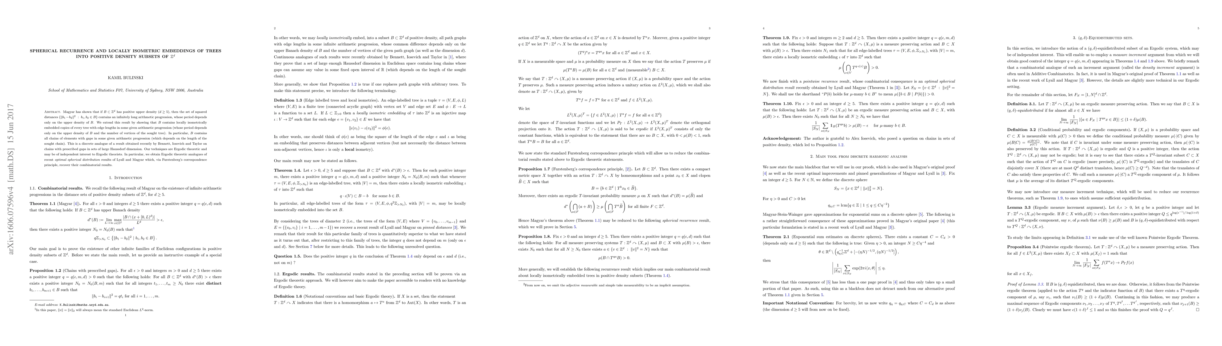 Magyar has shown that if $B \subset \mathbb{Z}^d$ has positive upper density $(d \geq 5)$, then the set of squared distances $\{ \|b_1-b_2 \|^2 \text{ }: \text{ } b_1,b_2 \in B \}$ contains an infinitely long arithmetic progression, whose period depends only on the upper density of $B$. We extend this result by showing that $B$ contains locally isometrically embedded copies of every tree with edge lengths in some given arithmetic progression (whose period depends only on the upper density of $B$ and the number of vertices of the sought tree). In particular, $B$ contains all chains of elements with gaps in some given arithmetic progression (which depends on the length of the sought chain). This is a discrete analogue of a result obtained recently by Bennet, Iosevich and Taylor on chains with prescribed gaps in sets of large Haussdorf dimension. Our techniques are Ergodic theoretic and may be of independent interest to Ergodic theorists. In particular, we obtain Ergodic theoretic analogues of recent \textit{optimal spherical distribution} results of Lyall and Magyar which, via Furstenberg's correspondence principle, recover their combinatorial results.
