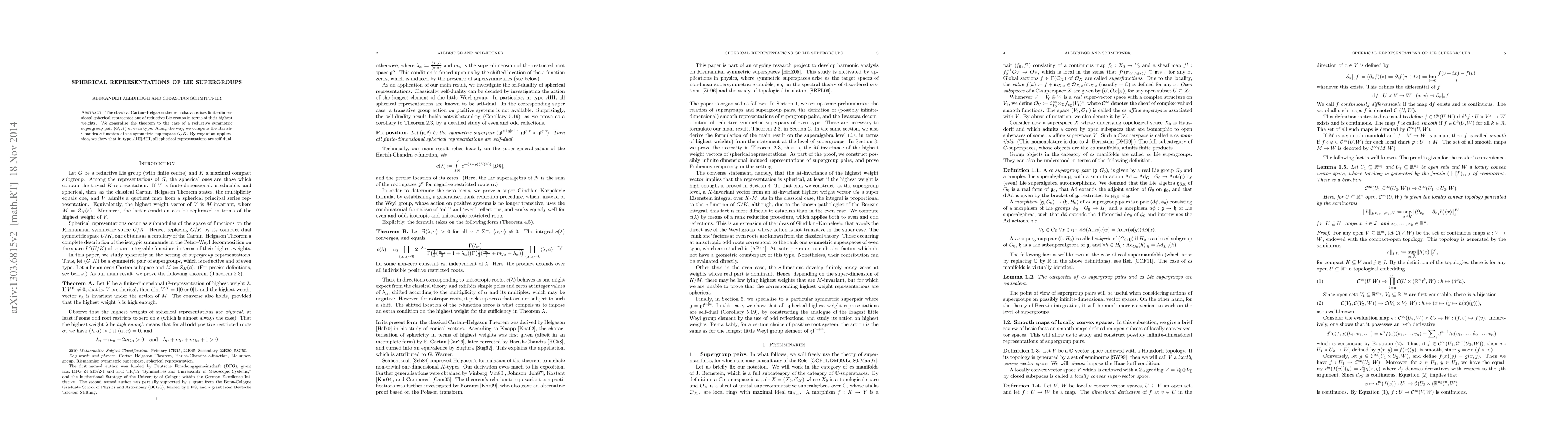The classical Cartan-Helgason theorem characterises finite-dimensional spherical representations of reductive Lie groups in terms of their highest weights. We generalise the theorem to the case of a reductive symmetric supergroup pair $(G,K)$ of even type. Along the way, we compute the Harish-Chandra $c$-function of the symmetric superspace $G/K$. By way of an application, we show that all spherical representations are self-dual in type AIII|AIII.