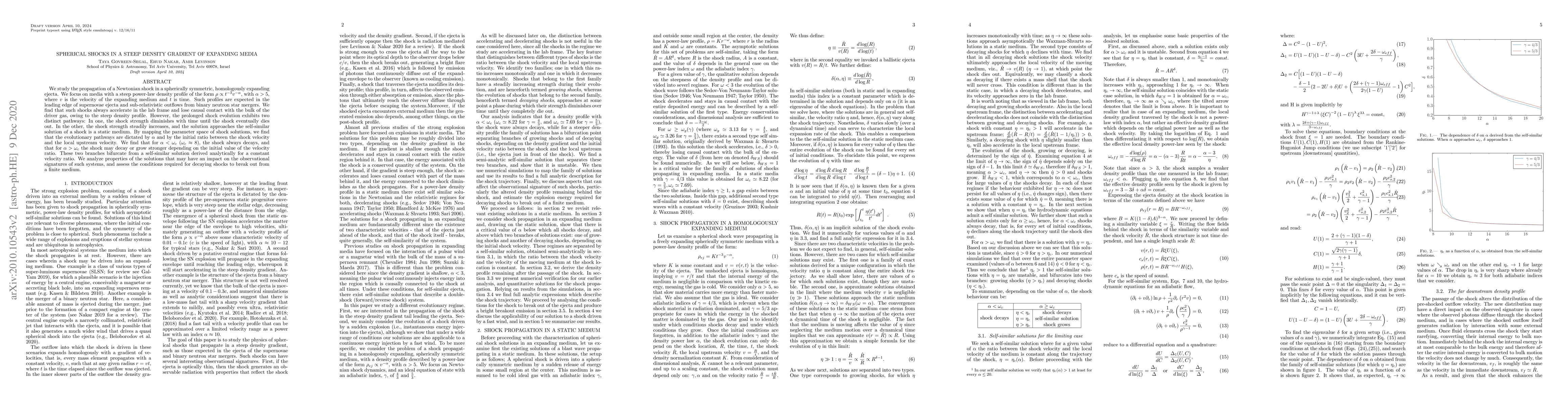 Researchers studied spherical shocks in expanding media with steep density profiles, finding that shocks accelerate and lose contact with the driver gas, but can either decay or grow stronger depending on the initial velocity ratio.