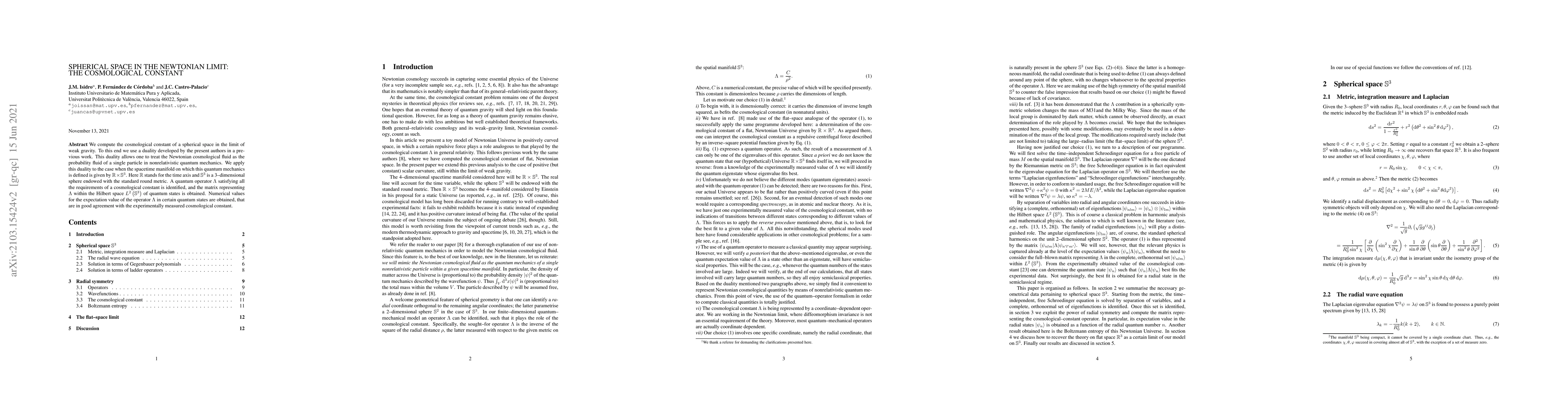 This research calculates the cosmological constant for a spherical space under weak gravity, utilizing a novel duality approach that treats Newtonian fluid dynamics as quantum mechanics. The authors identify a quantum operator $\Lambda$ and find its matrix representation, yielding values for the cosmological constant consistent with experimental measurements.