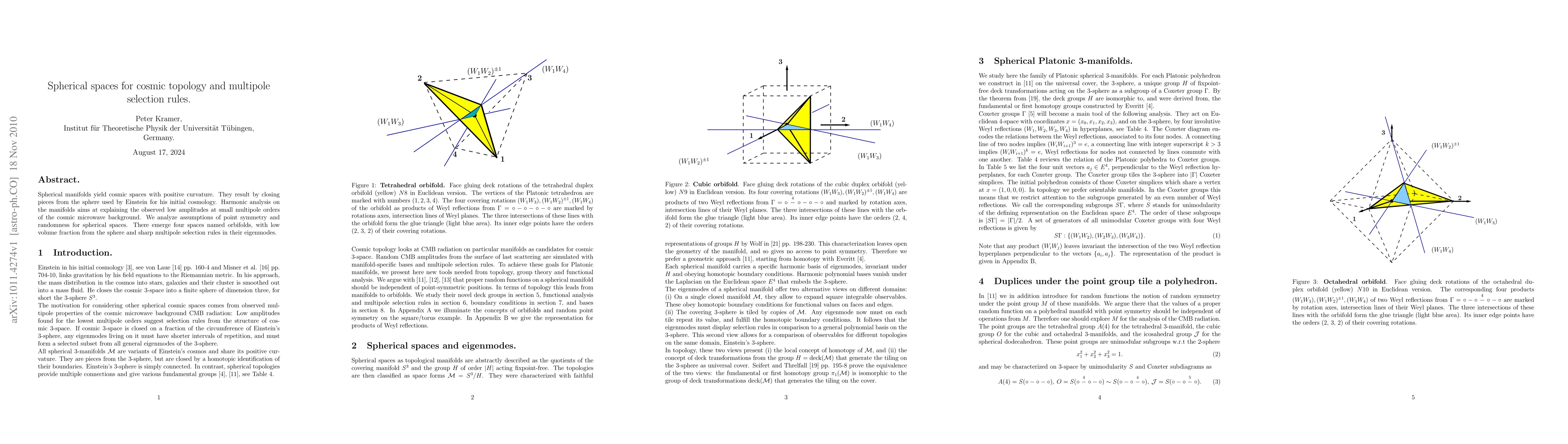 This paper explores spherical manifolds with positive curvature to explain low amplitudes in cosmic microwave background multipoles, deriving four unique "orbifold" spaces that exhibit low volume and strict selection rules in their eigenmodes. It investigates point symmetry and randomness assumptions for these cosmic topologies.