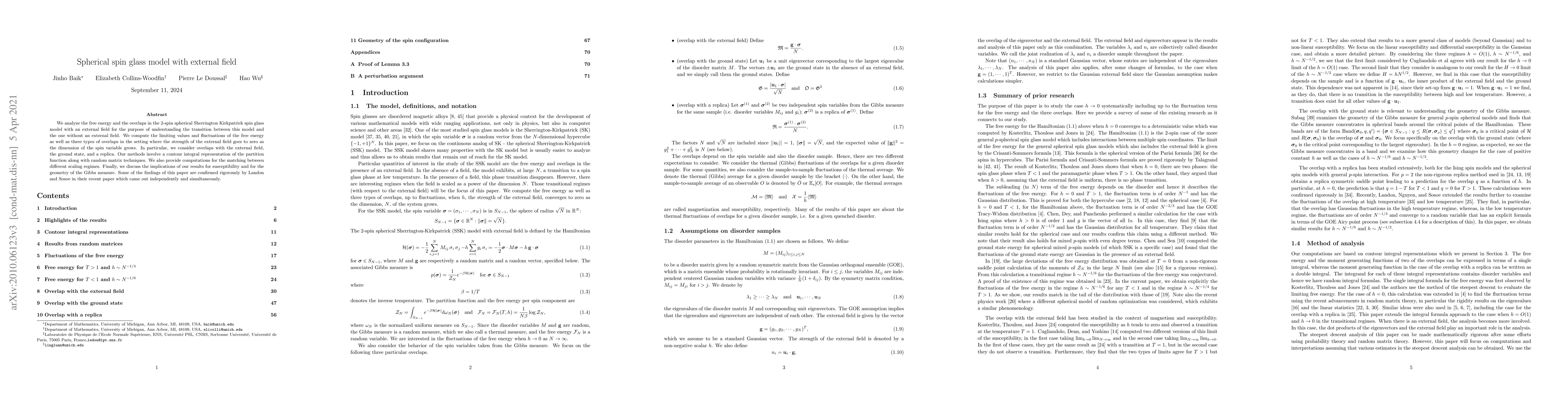 This paper investigates the transition in the spherical Sherrington Kirkpatrick spin glass model with an external field by analyzing free energy and overlaps. It employs contour integral representations and random matrix techniques to compute limiting values and fluctuations, and discusses the implications for susceptibility and Gibbs measure geometry.
